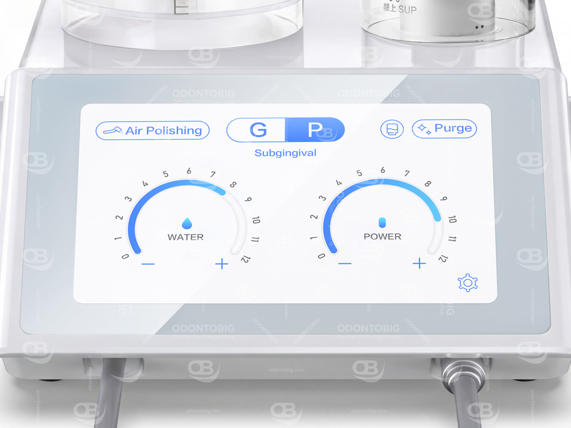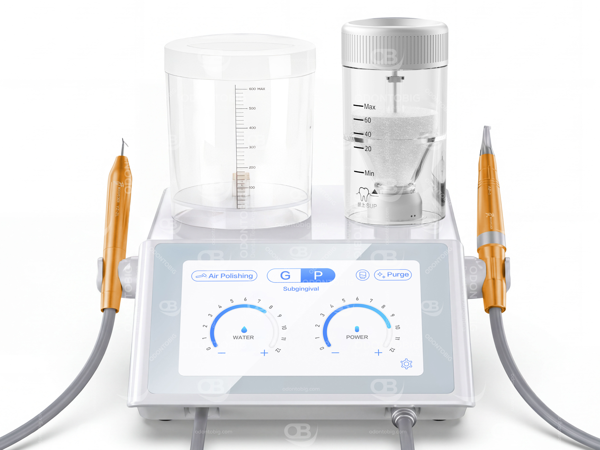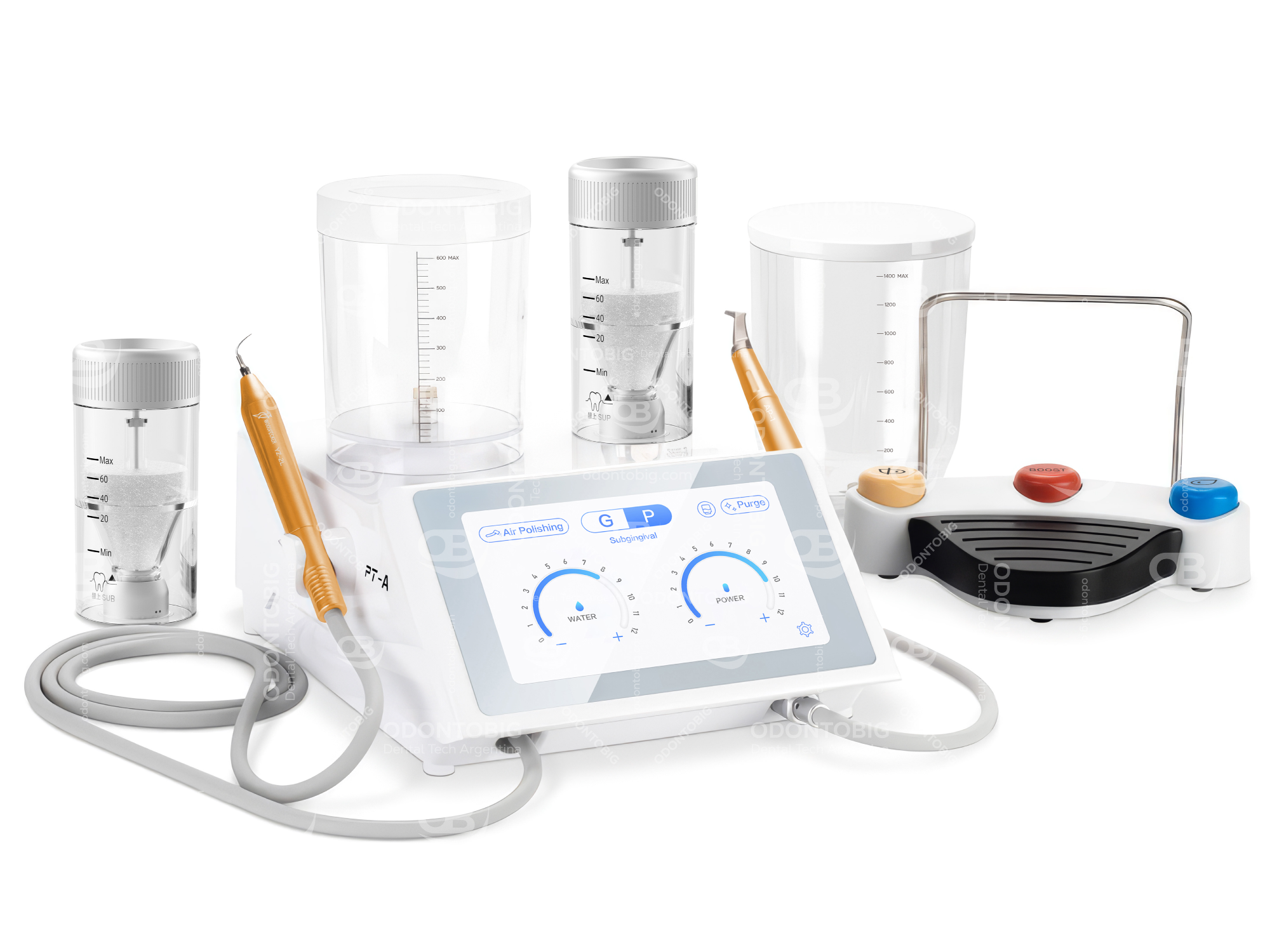 Una de sus grandes fortalezas es que reúne en una sola unidad funciones de scaler ultrasónico y air polisher, permitiendo abordar desde detartraje supragingival y subgingival hasta pulido, control de placa, remoción de pigmentaciones y mantenimiento periimplantario.