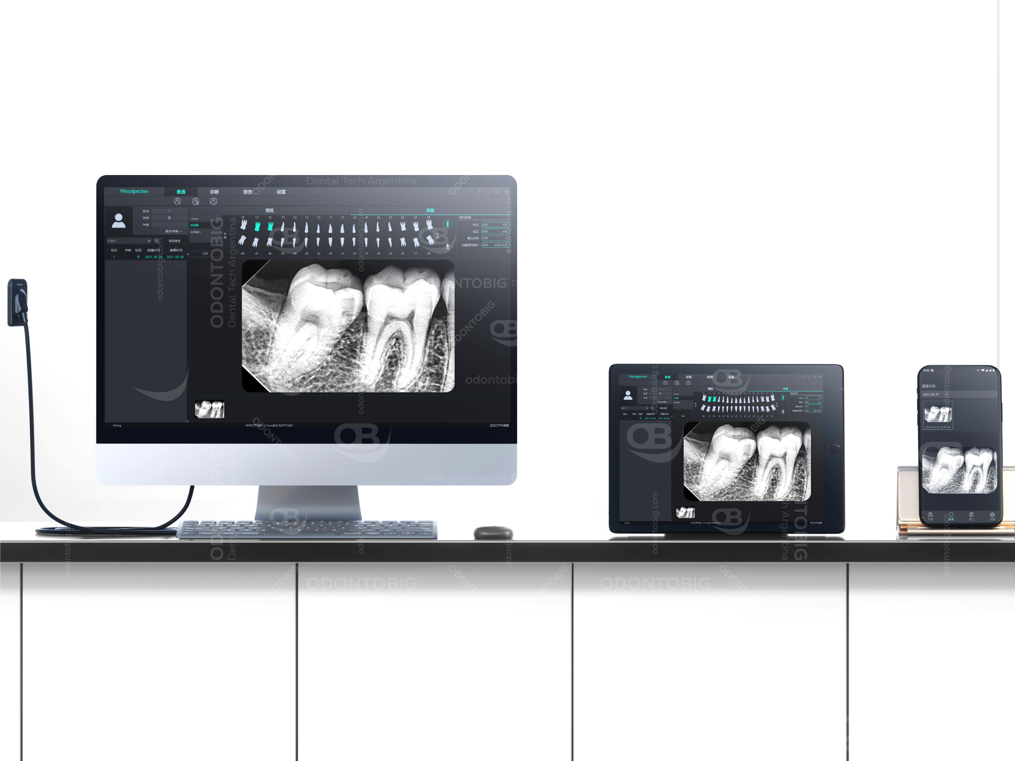 A eso se suma el ecosistema Ai-Dental, una plataforma con inteligencia artificial que permite adquisición, visualización, almacenamiento, administración de pacientes, administración de estudios, procesamiento de imagen, mediciones, calibración y generación de reportes en PDF.