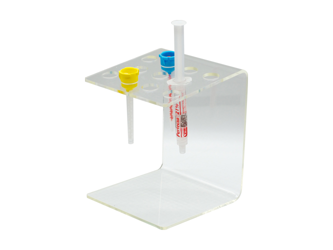 Organizador fabricado en acrílico transparente, diseñado para almacenar y ordenar hasta 11 jeringas de composite de manera práctica y accesible.