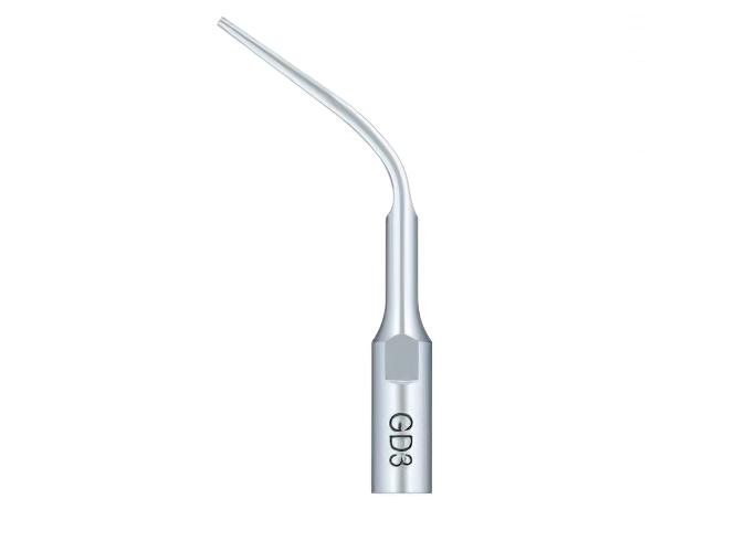 La punta GD3 está diseñada para la eliminación de cálculos y depósitos supragingivales e interproximales. Su diseño fino y curvado permite un acceso preciso a todas las superficies dentales, facilitando una profilaxis eficaz y segura.