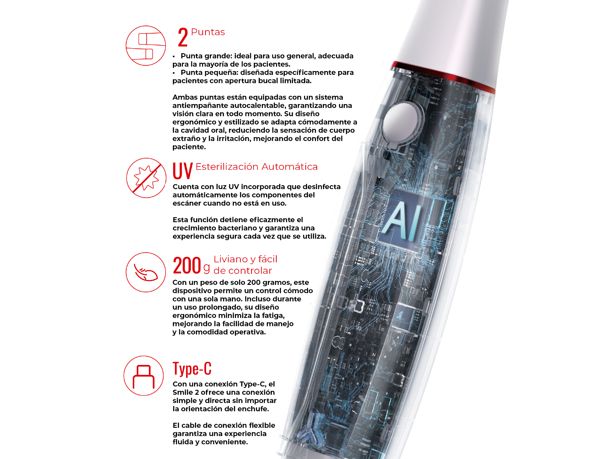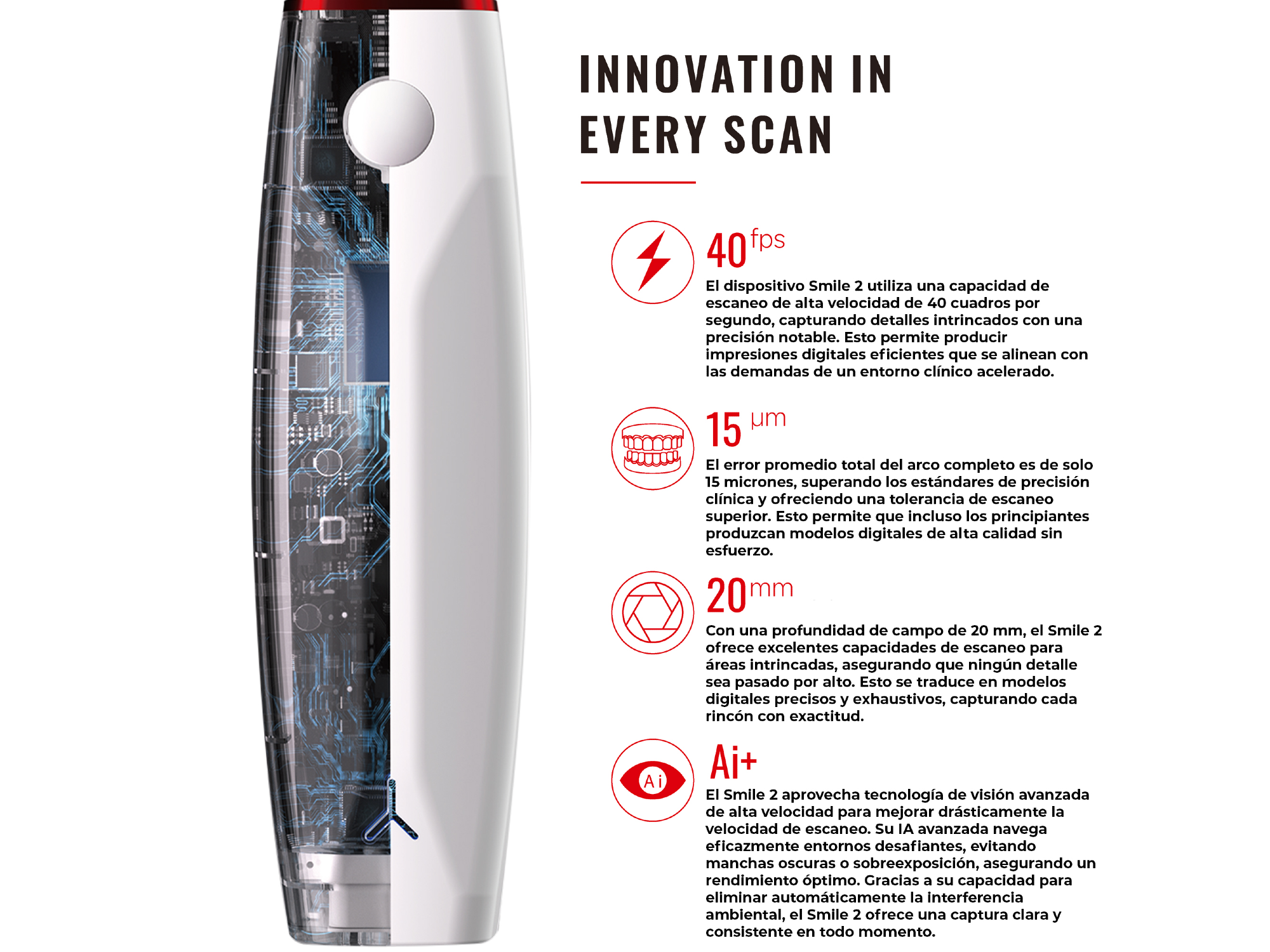 El Smile 2 de Woodpecker redefine la digitalización odontológica combinando velocidad, precisión y tecnología de inteligencia artificial avanzada (Ai+). Con un escaneo ultra rápido de 40 fps y una precisión de 15 μm, este escáner permite obtener impresiones digitales de alta fidelidad, optimizando el flujo de trabajo clínico y mejorando la experiencia del paciente.