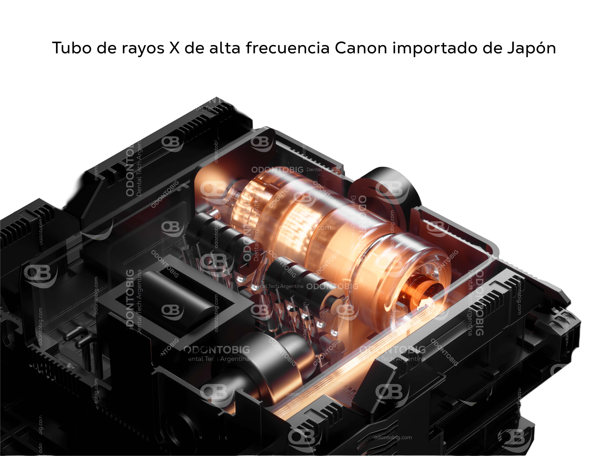 Uno de sus diferenciales más fuertes está en el sistema de generación. Posee un tubo de rayos X de alta frecuencia Canon Japón importado, acompañado por una potencia de emisión de hasta 210 W y un foco de 0,4 mm. Esta combinación apunta a exposiciones más cortas, salida estable y una imagen más clara y precisa para distintas necesidades diagnósticas.