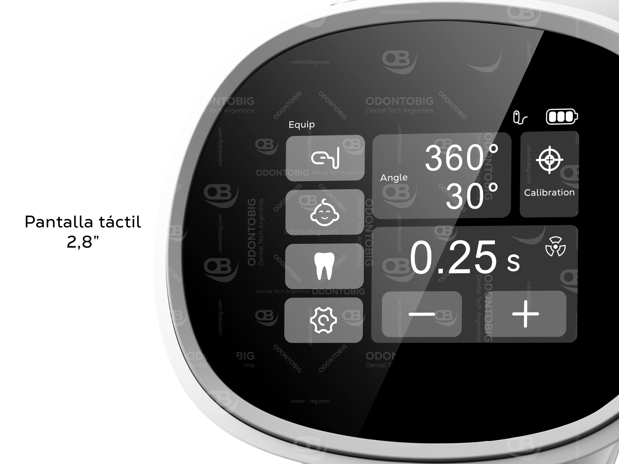 El Ai Ray incorpora pantalla táctil capacitiva de 2,8", con una interfaz clara, directa y visualmente moderna, que reemplaza la lógica tradicional de botones físicos. Desde allí se puede seleccionar el tipo de receptor, el modo adulto o niño, la posición dentaria, el ángulo de referencia y el tiempo de exposición, con una operación mucho más intuitiva y ordenada.