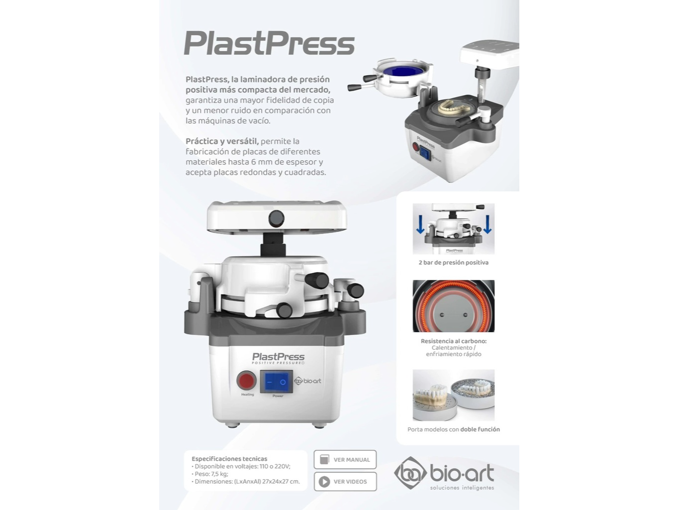Termoformadora PlastPress – Presión Positiva – BIO-ART Tecnología de presión positiva para máxima fidelidad y versatilidad La PlastPress de Bio-Art es una termoformadora de presión positiva diseñada para brindar una copia extremadamente fiel y precisa en la confección de alineadores, contenciones, férulas y guías quirúrgicas. Su tecnología reduce el ruido respecto a las máquinas de vacío convencionales, ofreciendo un entorno de trabajo más cómodo y eficiente. Gracias a su diseño compacto y práctico, permite trabajar con placas redondas y cuadradas de hasta 6 mm de espesor, adaptándose a múltiples materiales. Además, su portamodelos dual brinda dos configuraciones: plano, para una copia de extensión completa, e invertido/taza, que facilita la remoción en modelos con retenciones o placas rígidas. ___________ Características principales: • Versátil: admite placas redondas y cuadradas, hasta 6 mm de espesor • Rapidez: permite confeccionar y entregar placas en una sola sesión • Retorno de inversión acelerado: en promedio, con apenas 30 placas producidas • Portamodelos adaptable con dos modos de uso (plano e invertido) • Compacta, de fácil instalación y compatible con compresores estándar (3 a 8 bar) • Calentamiento rápido y uniforme para resultados consistentes Usos recomendados: • Alineadores y contenciones post-ortodoncia • Férulas miorrelajantes y placas de mordida • Protectores bucales personalizados • Guías quirúrgicas • Moldes y cubetas individuales • Bandejas para blanqueamiento y topicación con flúor • Matrices para restauraciones de composite Especificaciones técnicas: • Voltajes disponibles: 110V o 220V • Conexión: compresor de 3 a 8 bar (43,5 – 116 psi) • Peso: 7,5 kg • Dimensiones: 27 × 24 × 27 cm • Espesor de placas: 0,3 a 6 mm Ventajas adicionales: • Diseño compacto y silencioso • Alta fidelidad de copia • Instalación sencilla • Compatible con una amplia gama de materiales Marca: Bio-Art Origen: Brasil Video: https://www.youtube.com/watch?v=sIjLCA7js9M ___________ ODONTOBIG | Equipamiento + Tecnología + Insumos para odontólogos y médicos. Garantía, servicio y respaldo para clínicas y profesionales. ¡Aprovechá la PROMO de financiación + envío GRATIS! 💳 3 y 6 cuotas fijas GARANTIZADAS todos los días con todas las tarjetas ✅ Precio de lista DESCUENTO abonando con transferencia bancaria ⭐️ Envío gratis a todo el país en compras superiores a $250.000 Atención experta y personalizada ❇️ WhatsApp: +54 9 3813321794 No dude en comunicarse ¡su consulta no molesta!