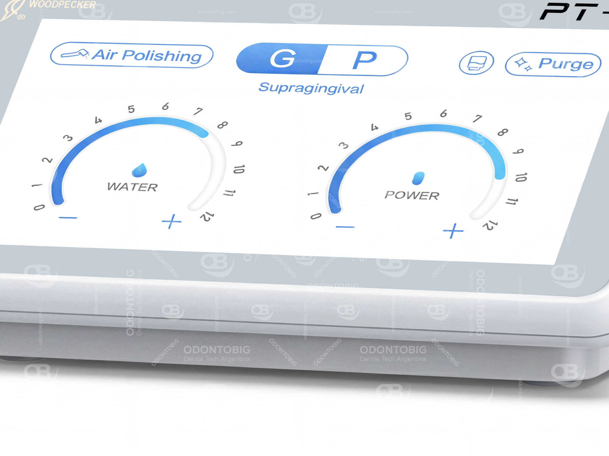 Otro punto fuerte del PT-A es su enfoque en ergonomía y fluidez operativa. El equipo identifica automáticamente el modo de trabajo según el handpiece que se levanta, permitiendo ingresar de forma directa al modo de scaling ultrasónico o al modo de air polishing sin pasos innecesarios.
