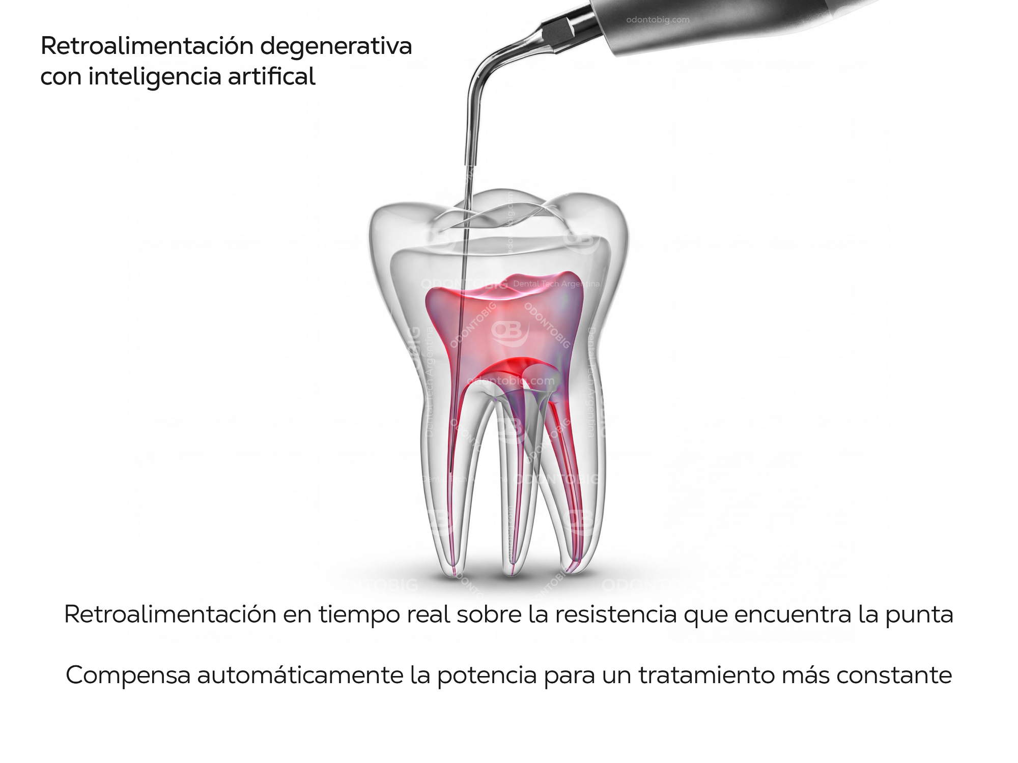 Uno de sus grandes diferenciales es su enfoque en la estabilidad real de tratamiento. Incorpora un sistema de retroalimentación inteligente que detecta en tiempo real la resistencia que encuentra la punta y compensa automáticamente la potencia para mantener una respuesta más constante. En clínica, esto se traduce en una vibración más estable, una sensación de trabajo más fluida y un tratamiento más cómodo tanto para el profesional como para el paciente.