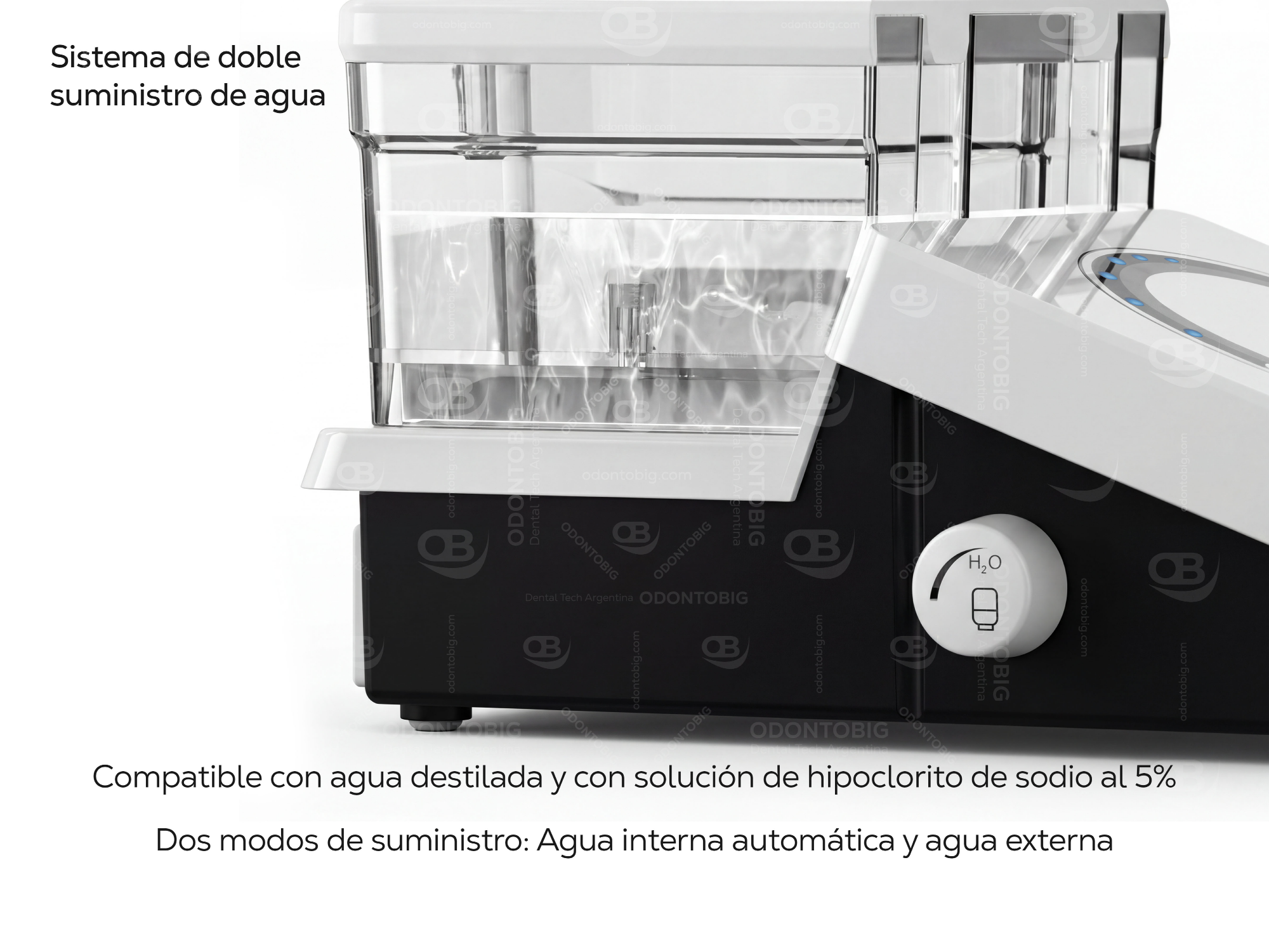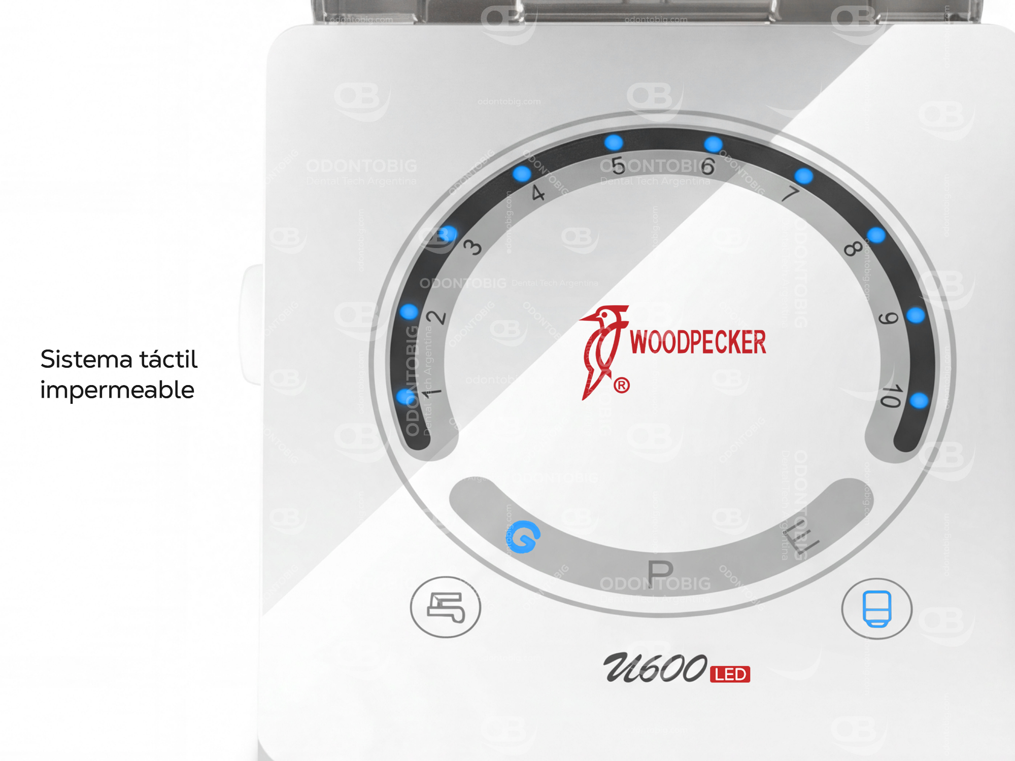 A nivel de irrigación, el Woodpecker U600 LED ofrece un doble sistema de suministro de agua, con posibilidad de trabajar tanto con agua externa como con suministro interno automático. Además, admite agua destilada y también solución de hipoclorito de sodio al 5%, algo especialmente interesante para procedimientos periodontales y endodónticos donde la versatilidad del sistema suma valor real.