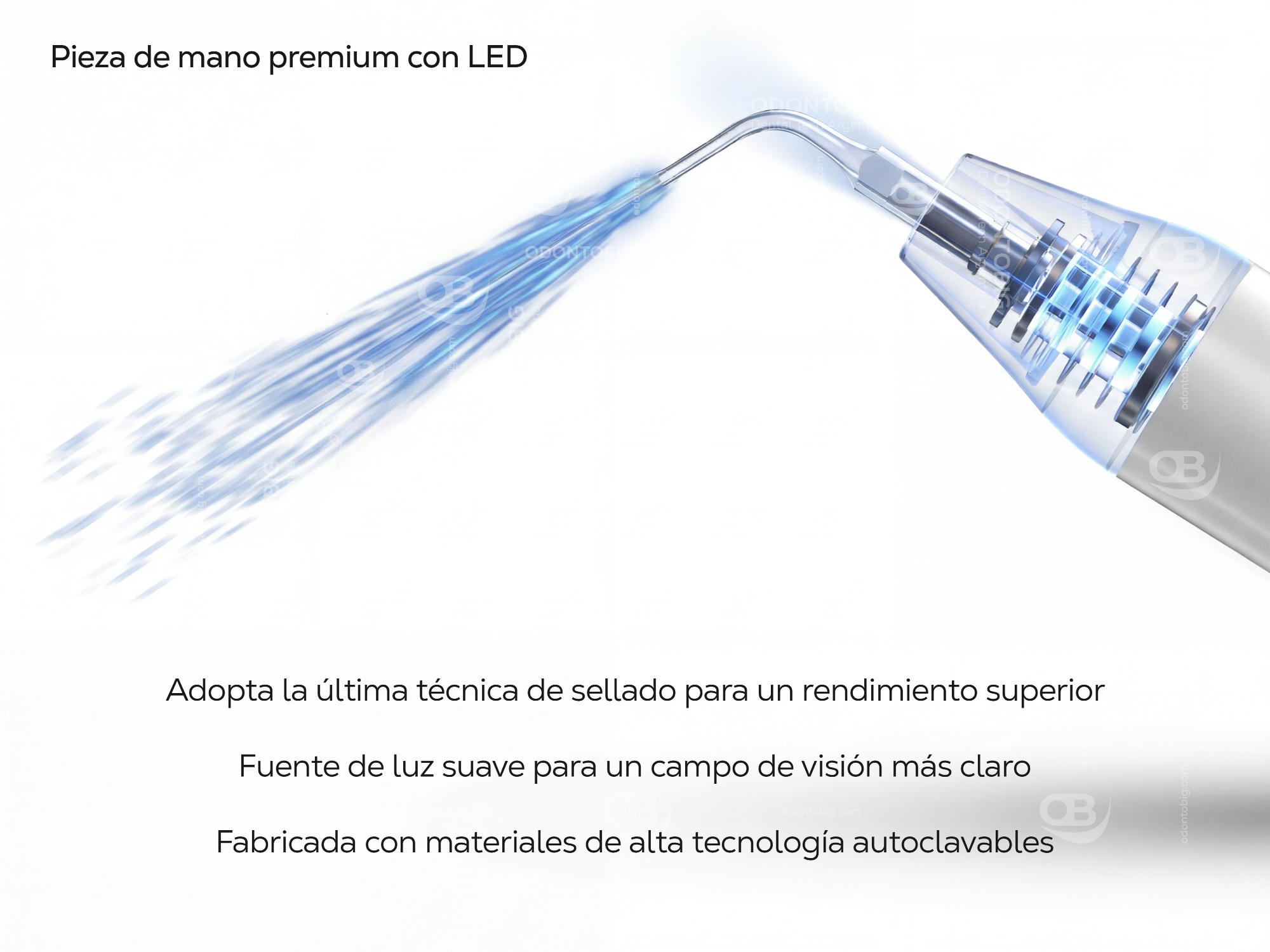 También destaca por su pieza de mano premium con luz LED, ideal para mejorar la visibilidad del campo operatorio y trabajar con mayor precisión, especialmente en zonas de acceso más delicado. Además, está fabricada con materiales de alta tecnología, es autoclavable y cuenta con un diseño sellado que ayuda a sostener una performance confiable en el tiempo.