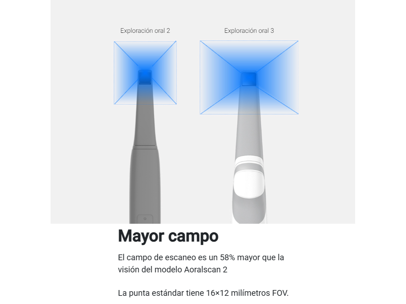 • De hasta 22 milímetros. Aoralscan 3 es adecuado para varios escenarios clínicos, incluida la adquisición de cuerpos de escaneo y escaneos periodontales.