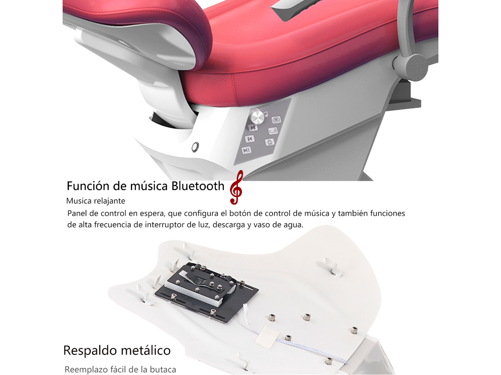 • Función de música Bluetooth: Sumérjase en un ambiente relajante con la función de música Bluetooth integrada. Disfrute de música relajante durante los procedimientos dentales para calmar los nervios y mejorar la experiencia del paciente, con capacidad para reproducir música en varios modos, incluyendo USB, Bluetooth y almacenamiento local.