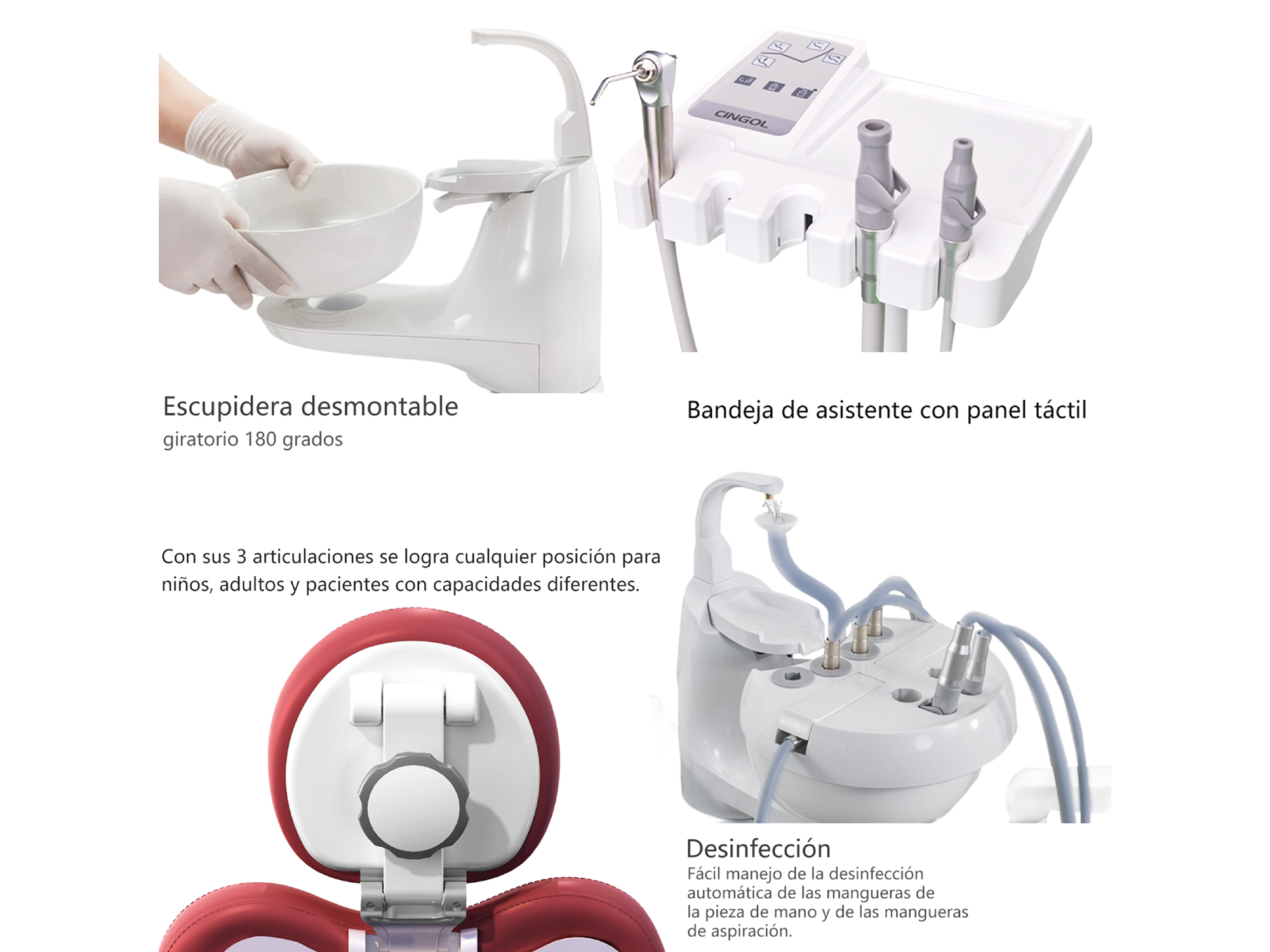 • El sistema de succión de saliva fuerte y débil incluye un filtro integrado en cada salida, con una estructura de doble sellado para garantizar la hermeticidad y facilitar la limpieza y desinfección.