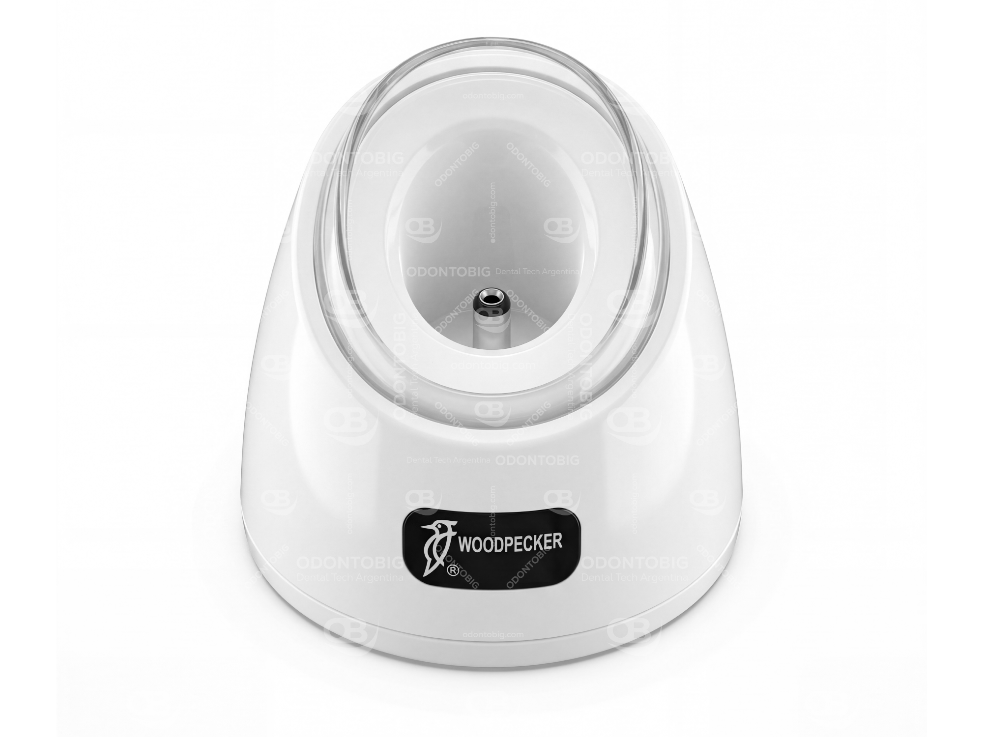 Woodpecker también pone mucho énfasis en el formato físico del equipo, ya que cuenta con una base de carga dedicada y una propuesta de autonomía orientada a acompañar la rutina clínica con practicidad. El equipo utiliza batería recargable de litio, cuenta con aviso de batería baja, puede utilizarse mientras se encuentra cargando y trabaja con batería sin efecto memoria, lo que vuelve mucho más flexible el uso diario.