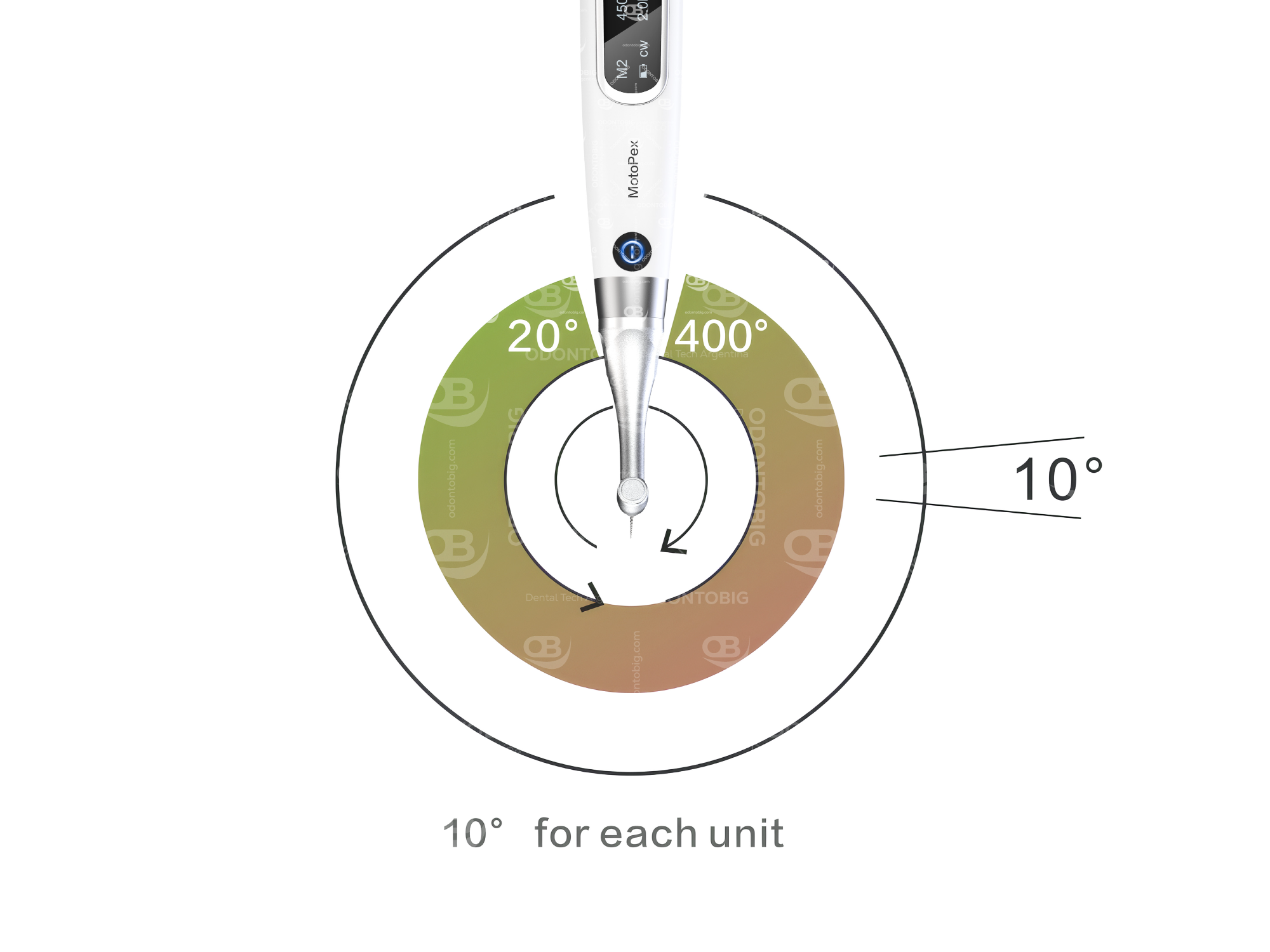 En reciprocación, ofrece ajuste angular cada 10°, con un rango de 20° a 400°. Esto permite adaptar con mucha más precisión el comportamiento del motor según el sistema de limas utilizado y la preferencia operatoria del profesional, ayudando a reducir el riesgo de fatiga o separación del instrumento y favoreciendo una preparación más estable.