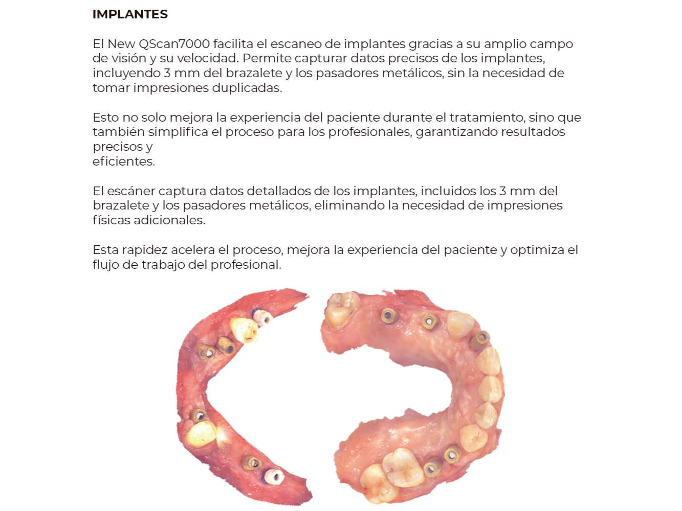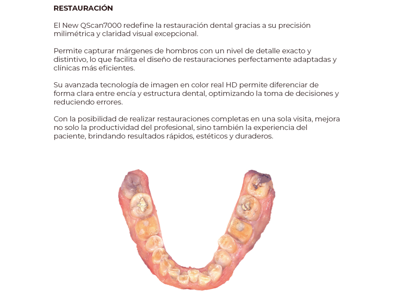 Con una combinación de inteligencia artificial, tecnología óptica de alta precisión y un software clínico potente, el New QScan7000 brinda una experiencia fluida de escaneo, con resultados rápidos y exactos. Es la herramienta ideal para restauraciones, ortodoncia e implantología, optimizando la planificación, la ejecución y la satisfacción del paciente.