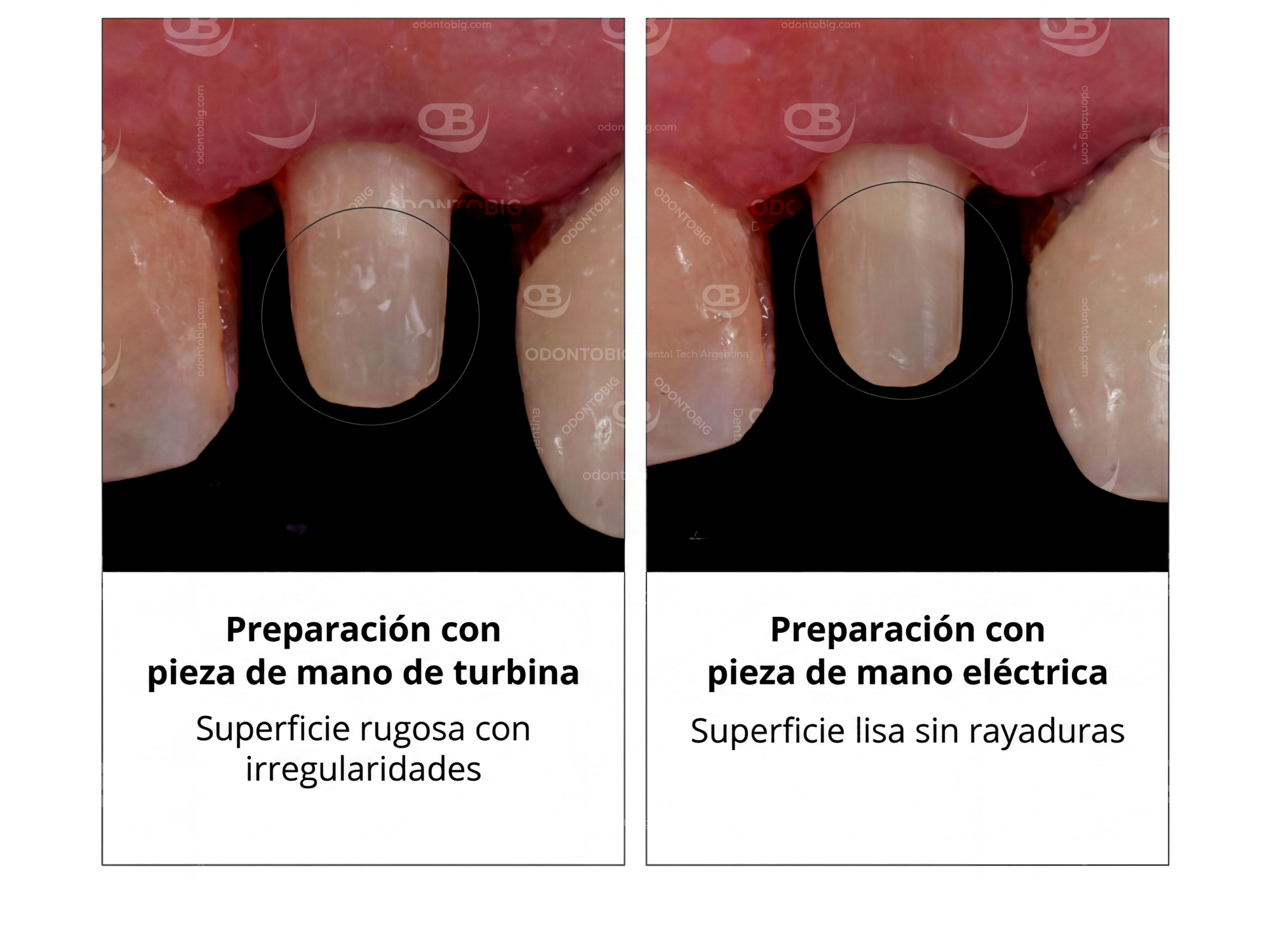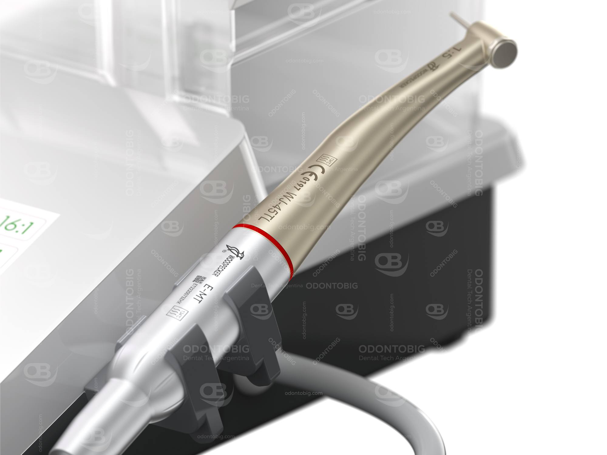 Su motor brushless E-MT trabaja con relaciones 16:1, 1:1 y 1:5, permitiendo adaptarse a diferentes exigencias clínicas. A esto se suma la posibilidad de utilizar modos Prep, Finish, Crown y Custom, además de giro forward/reverse y control de luz LED.