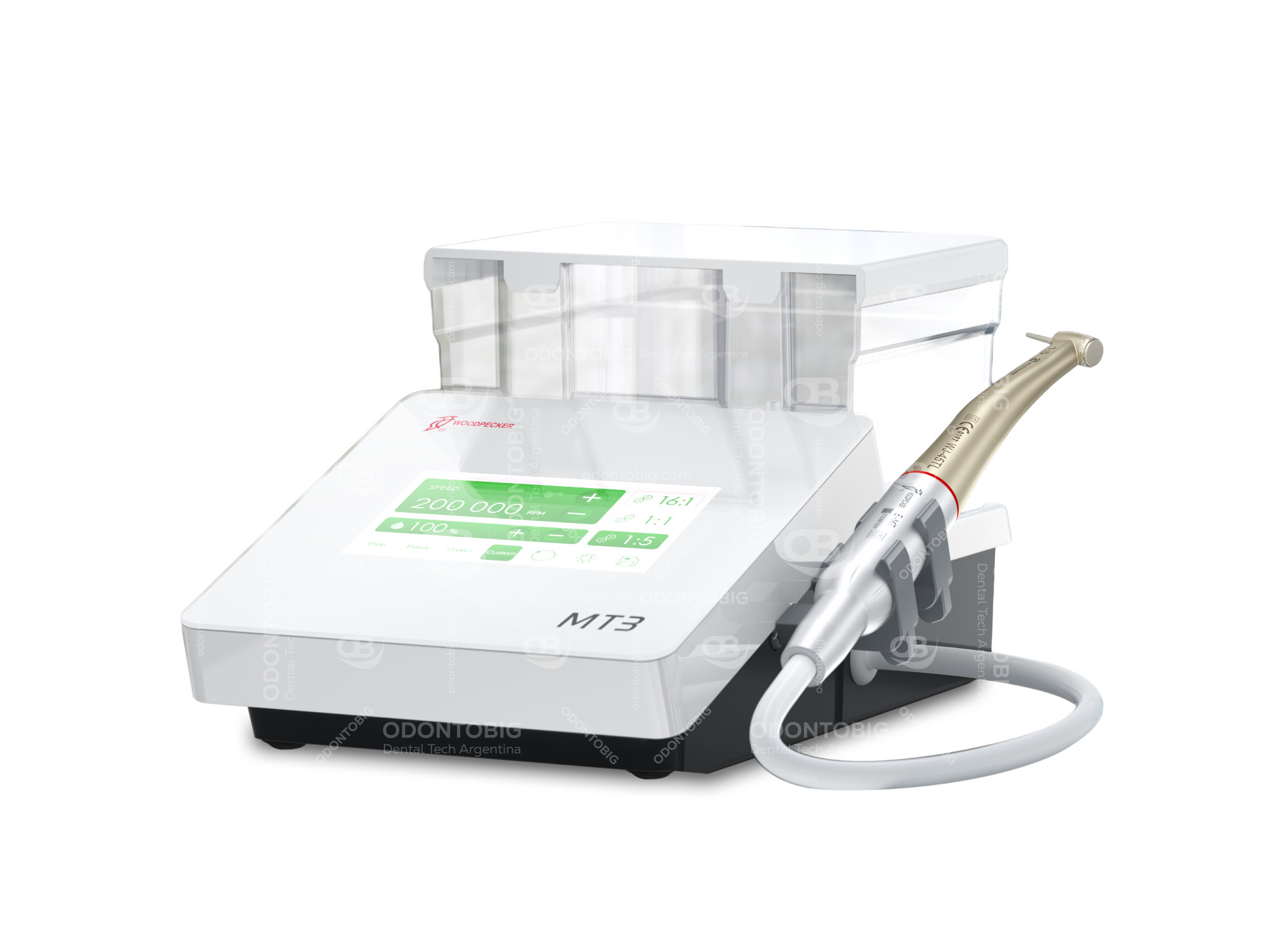 A nivel de instalación y uso diario, el MT3 ofrece un enfoque plug and play, con sistema automático de agua y aire y formato independiente de colocación libre, lo que facilita su integración en clínica sin depender de una instalación compleja sobre la unidad dental. Además, tiene compatibilidad con contra ángulos bajo norma ISO 3964 Tipo 2 y Tipo 3, y un motor esterilizable bajo los parámetros indicados por el fabricante, reforzando su perfil profesional para una práctica moderna, ordenada y exigente.