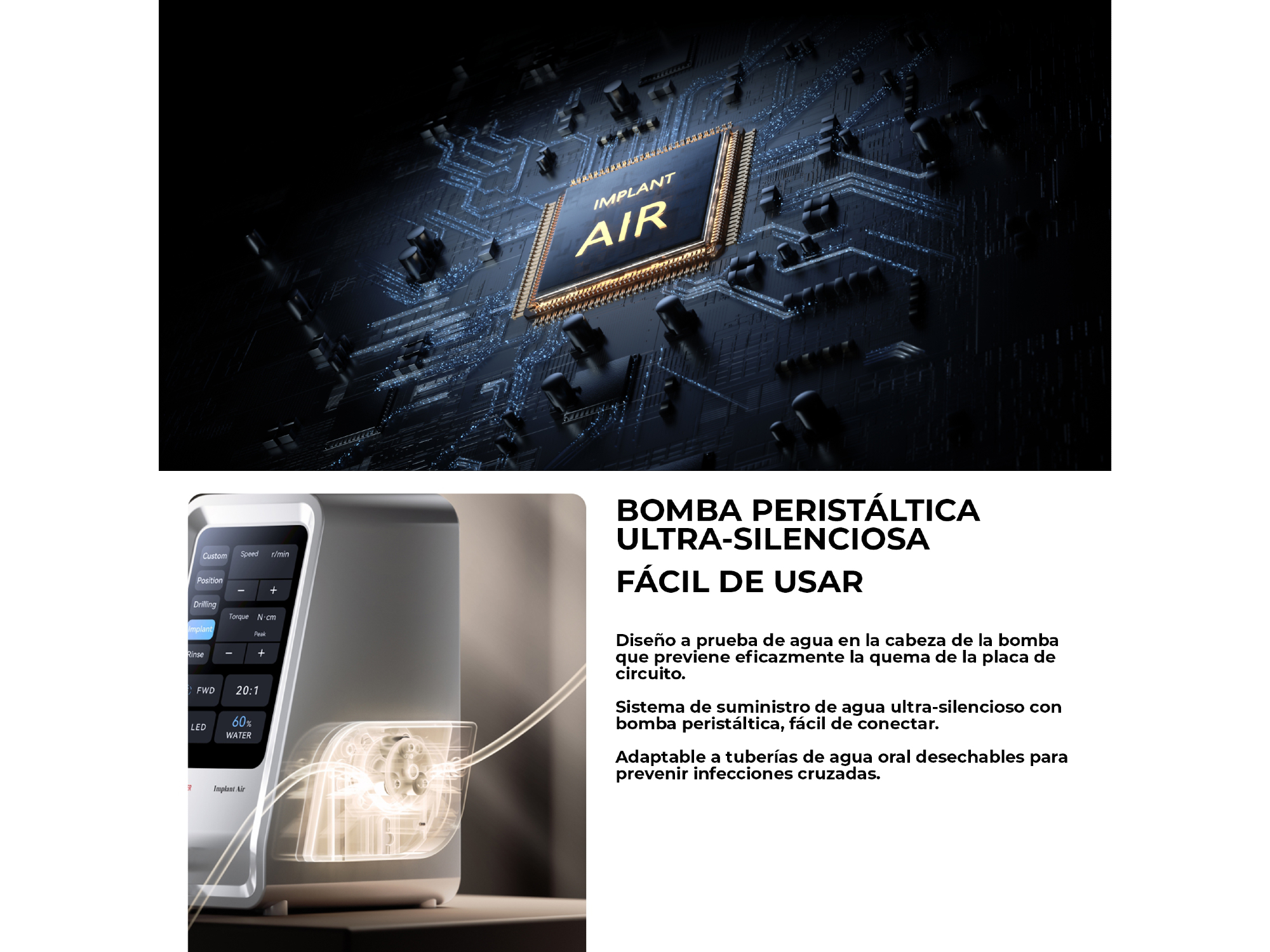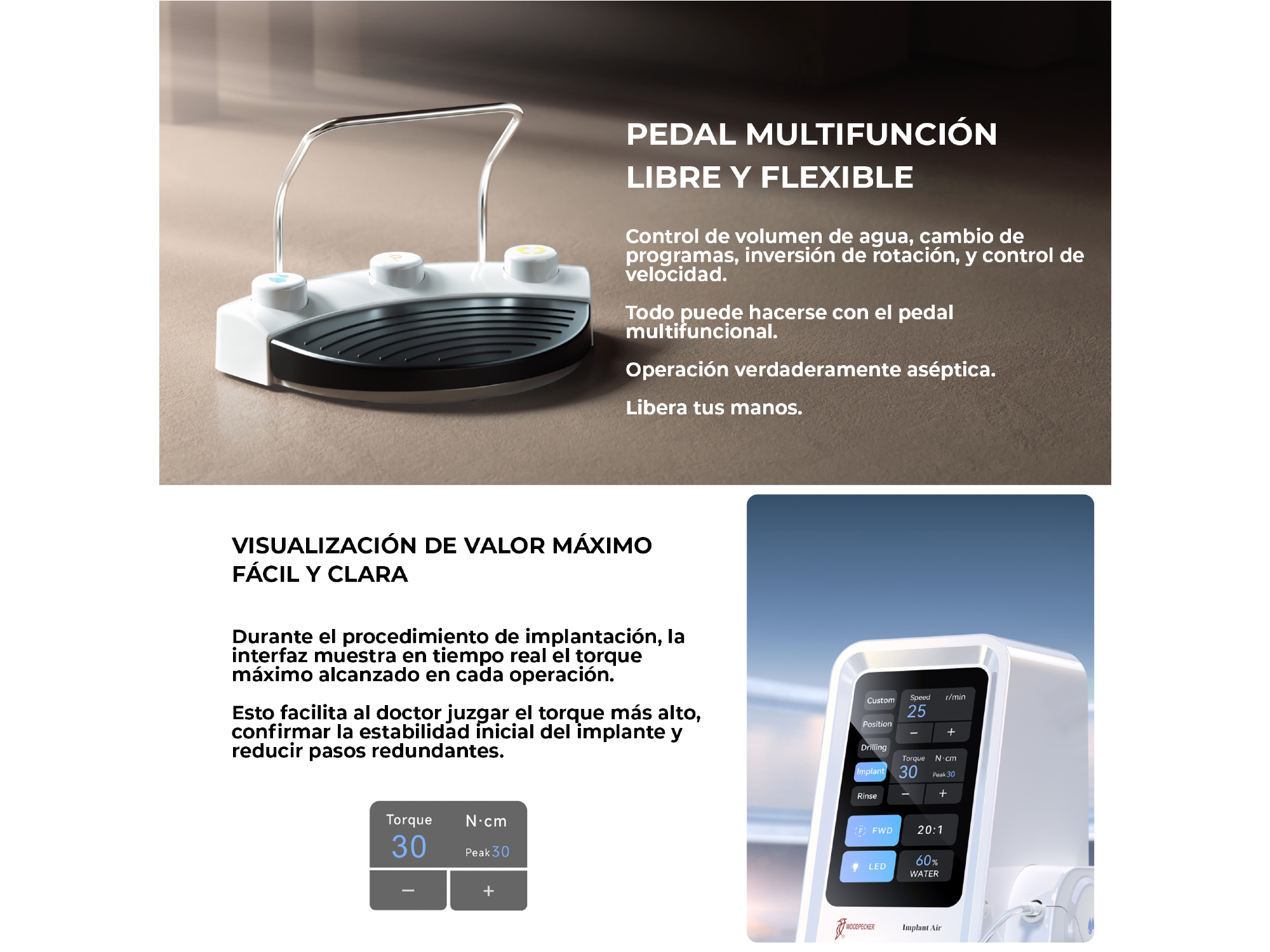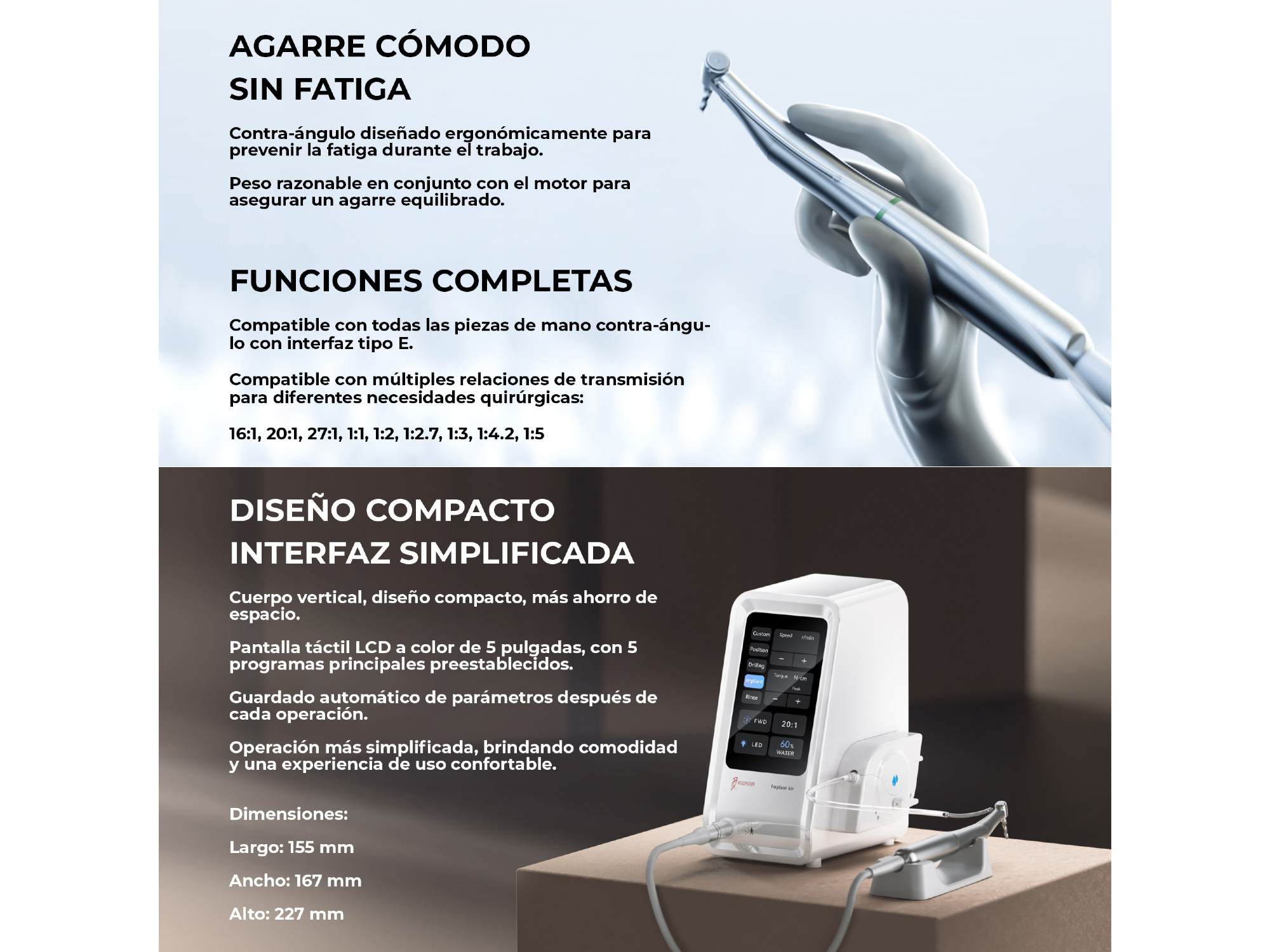 Fisiodispenser Implant Air - Con Contra Ángulo 20:1 LED | WOODPECKER El Fisiodispenser Implant Air de Woodpecker es un sistema avanzado de implantología diseñado para brindar precisión, confort y seguridad en procedimientos quirúrgicos. Diseño compacto cuerpo vertical, pantalla táctil LCD a color de 5” con 5 programas preestablecidos y guardado automático de parámetros. Ideal para uso clínico diario con foco en practicidad y consistencia. ___________ Características: • Bomba peristáltica ultra-silenciosa: diseño a prueba de agua, evita daños en la placa de circuito. Compatible con tuberías desechables para prevenir infecciones cruzadas • Diseño compacto: cuerpo vertical, pantalla táctil LCD a color de 5” con 5 programas preestablecidos y guardado automático de parámetros • Dimensiones: 155 × 167 × 227 mm • Agarre ergonómico: contra-ángulo diseñado para prevenir la fatiga y equilibrar el peso • Funciones completas: compatible con piezas de mano tipo E y múltiples relaciones de transmisión (16:1, 20:1, 27:1, 1:1, 1:2, 1:2.7, 1:3, 1:4.2, 1:5) • Visualización en tiempo real: muestra el torque máximo alcanzado durante el procedimiento para confirmar estabilidad del implante • Pedal multifunción: controla irrigación, programas, velocidad y rotación de manera aséptica • Motor suizo: 5.5 N·cm con pieza de mano 20:1, torque máximo de salida de 80 N·cm, con iluminación LED integrada • Rodamientos alemanes: desviación de <20 µm, mayor estabilidad y durabilidad en condiciones de alta y baja velocidad Beneficios destacados: • Flujo de trabajo seguro y silencioso • Interfaz intuitiva con guardado automático de parámetros • Ergonomía superior para evitar fatiga • Torque estable y control en tiempo real para mayor seguridad quirúrgica • Durabilidad y confiabilidad gracias a motor suizo y rodamientos alemanes Presentación: Unidad con accesorios. Marca: Woodpecker ___________ ODONTOBIG | Equipamiento + Tecnología + Insumos para odontólogos y médicos. Garantía, servicio y respaldo para clínicas y profesionales. ¡Aprovechá la PROMO de financiación + envío GRATIS! 💳 3 y 6 cuotas fijas GARANTIZADAS todos los días con todas las tarjetas ✅ Precio de lista DESCUENTO abonando con transferencia bancaria ⭐️ Envío gratis a todo el país en compras superiores a $250.000 Atención experta y personalizada ❇️ WhatsApp: +54 9 3813321794 No dude en comunicarse ¡su consulta no molesta!
