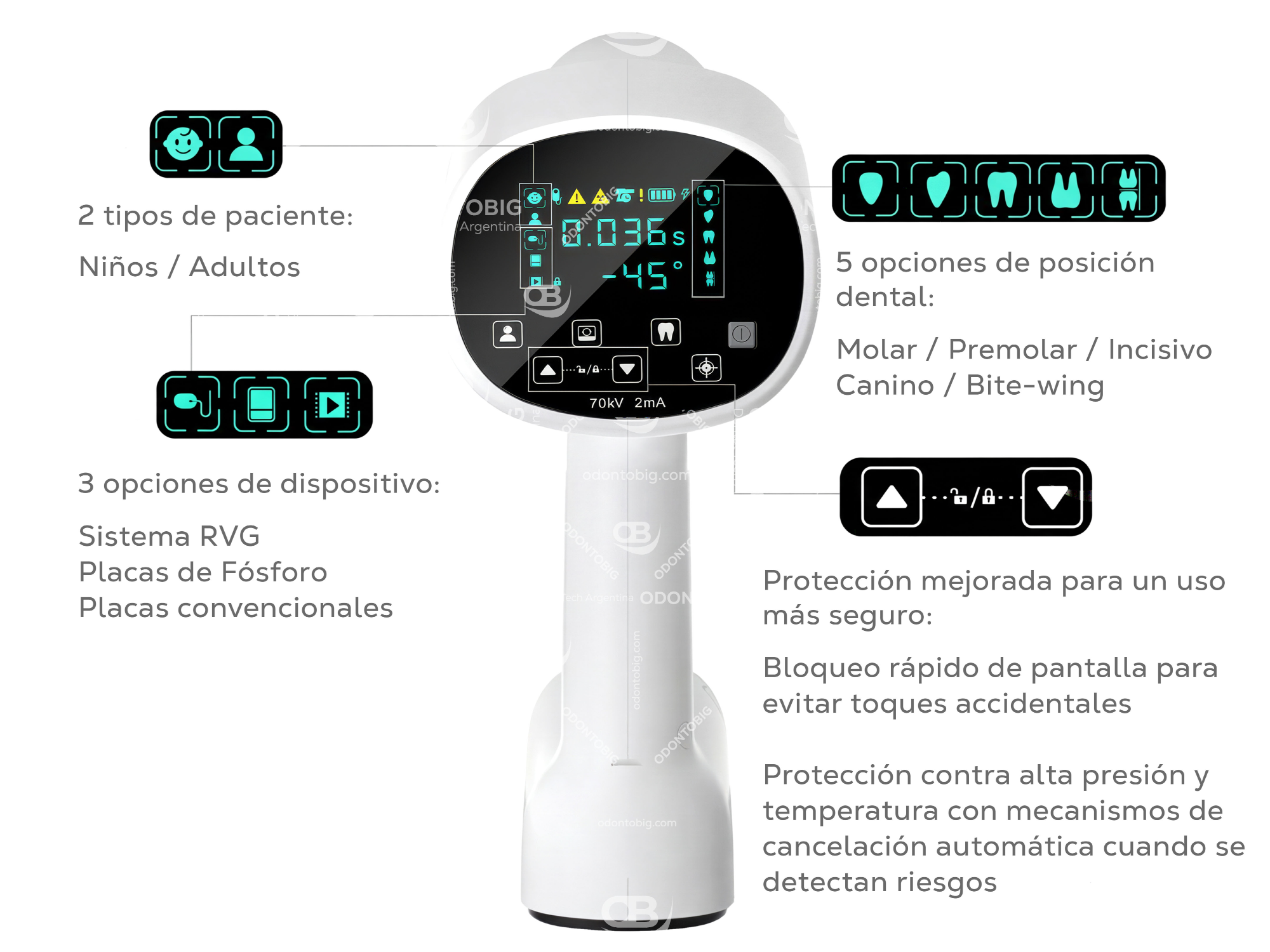 • Compatibilidad con sensor intraoral digital, escáner de placas y película