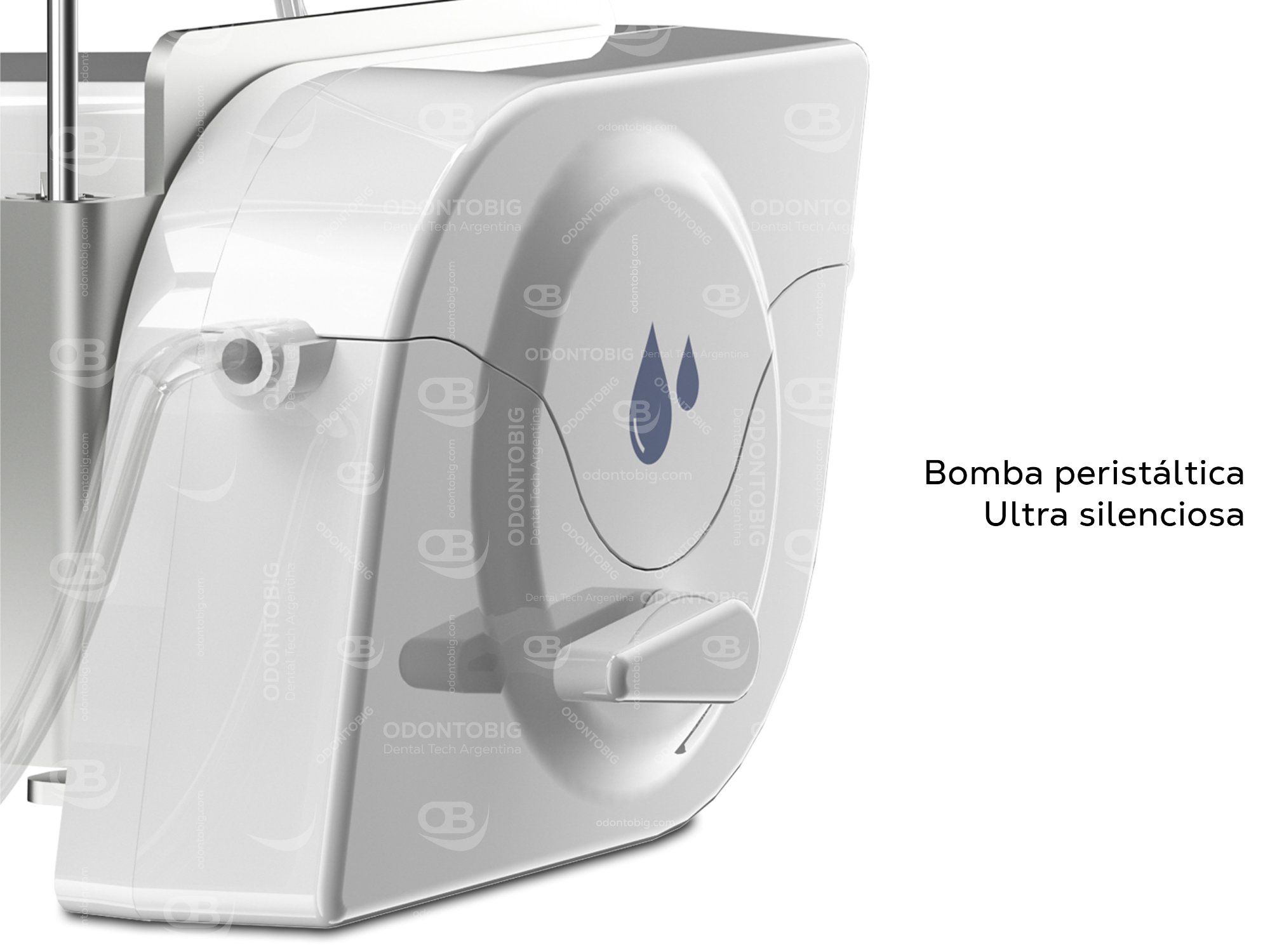 También permite controlar luz LED, agua, giro reversible y selección de relación de velocidad compatible con 16:1, 1:1, 1:4.2 y 1:5. En configuración 1:5, el sistema puede alcanzar hasta 200.000 rpm, lo que lo vuelve especialmente atractivo para trabajos que exigen velocidad, fineza, potencia y capacidad de respuesta desde una instalación fija en el sillón.