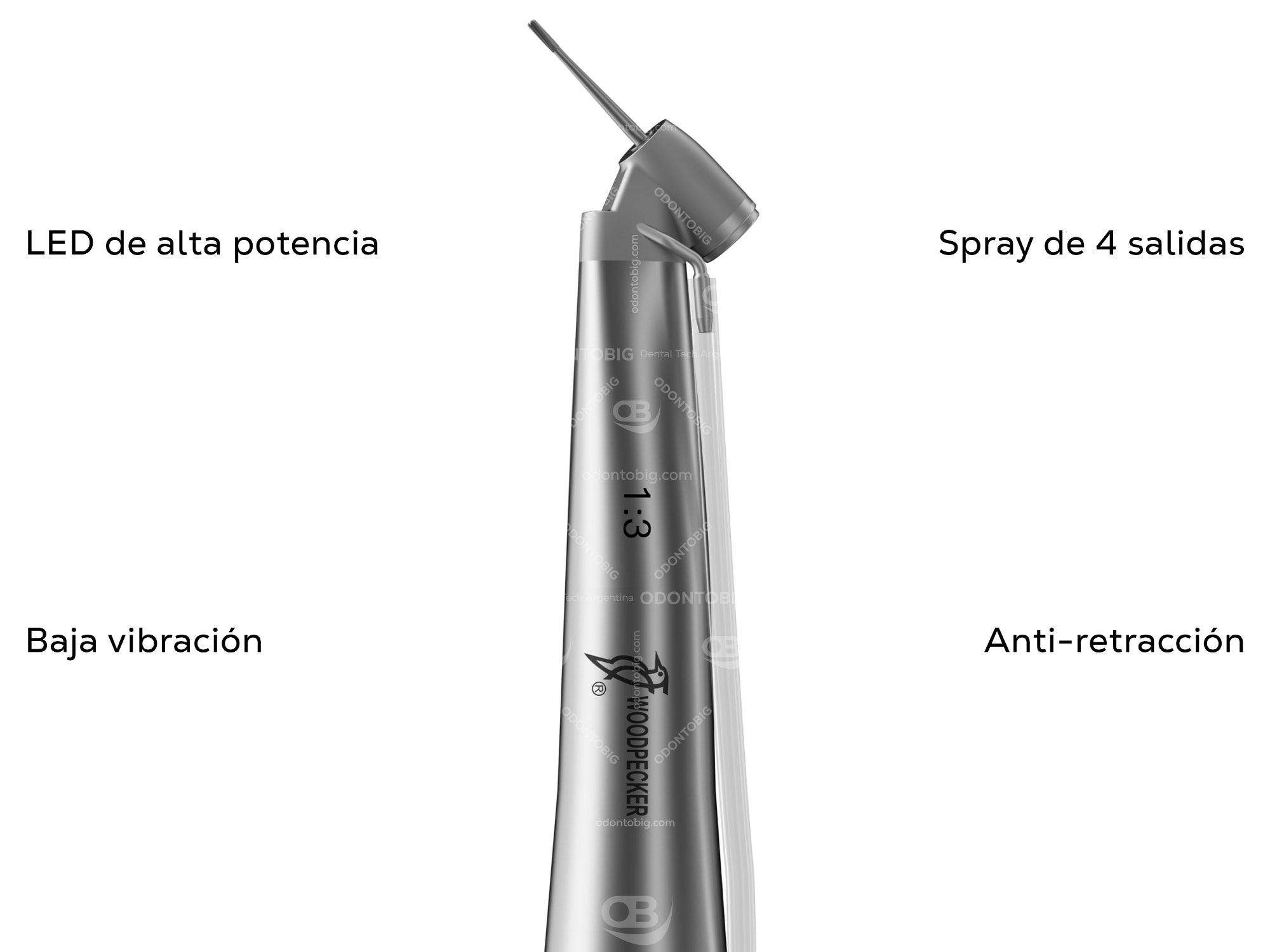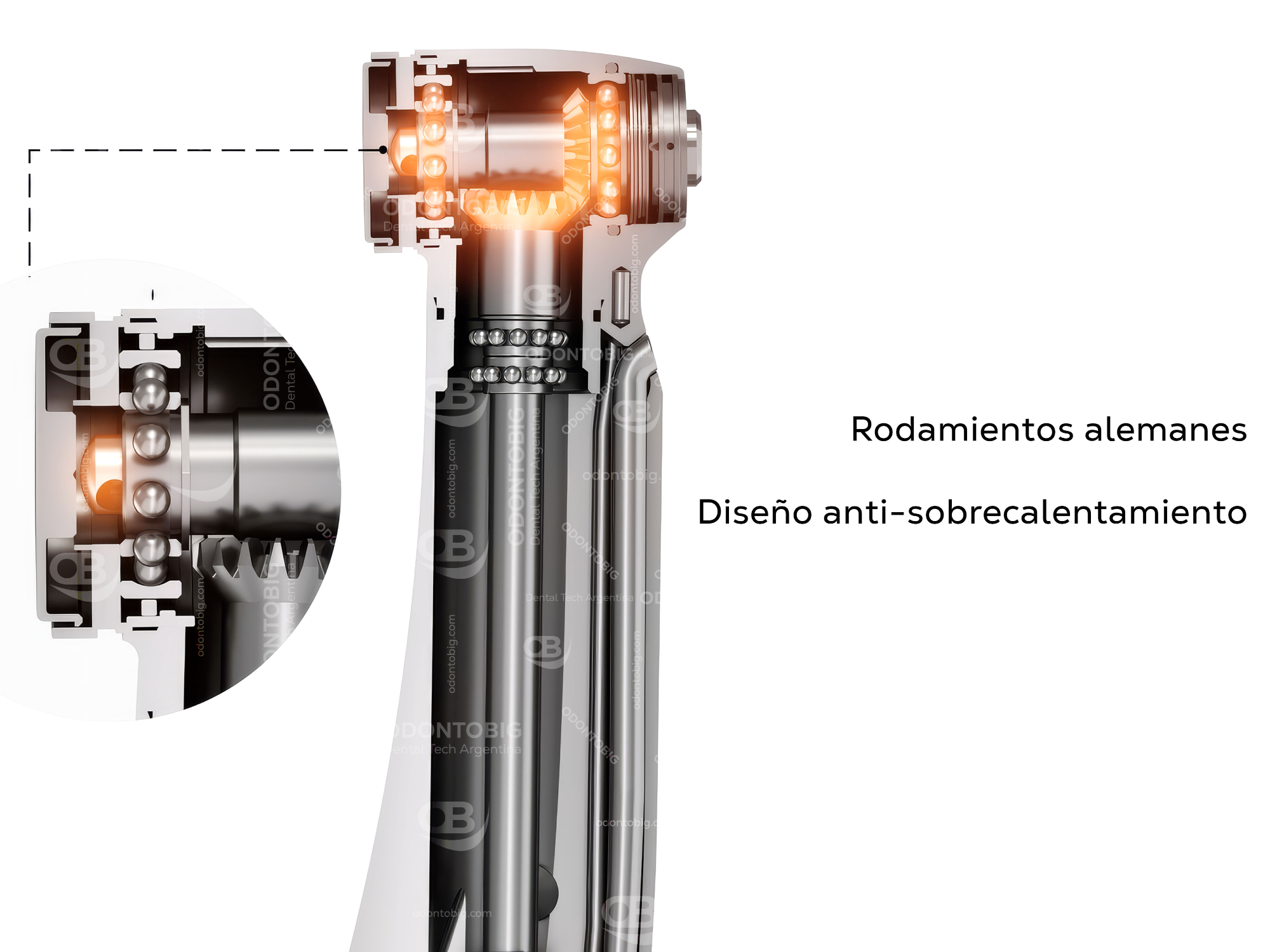 En seguridad operatoria, incorpora diseño anti-sobrecalentamiento para disminuir el riesgo de calentamiento accidental de la cubierta y estructura anti-retracción para ayudar a reducir contaminación cruzada y prolongar la vida útil del contra ángulo. Esto le da una lectura mucho más sólida como sistema clínico integral y no solo como motor de alto rendimiento.