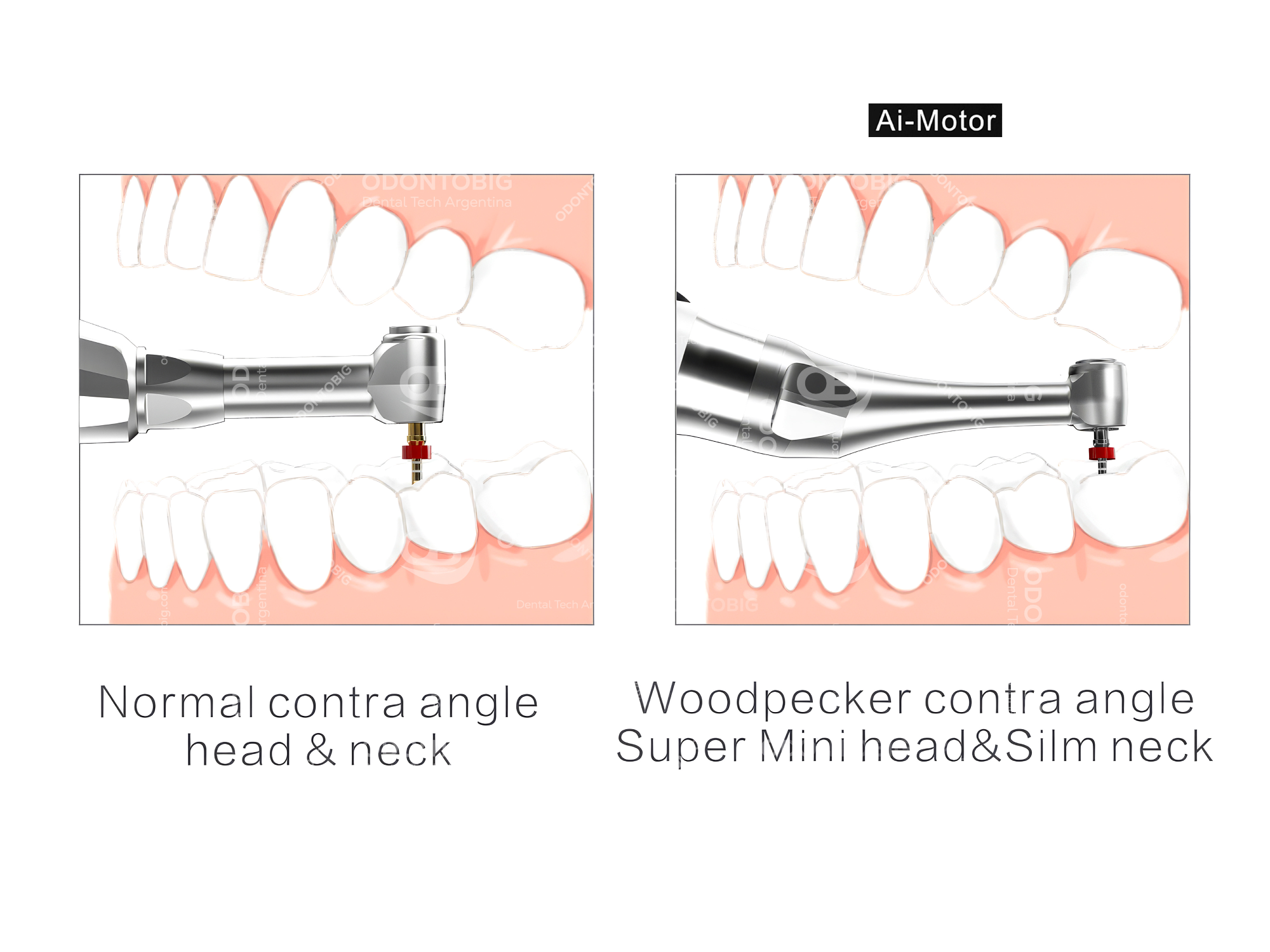 Woodpecker posiciona este modelo como su mejor endomotor brushless, y eso se traduce en varias ventajas concretas: funcionamiento más suave, menor nivel de ruido, mejor estabilidad y una salida de torque más consistente. El contraángulo 6:1 con rotación 360° mejora la adaptación de trabajo según la posición del caso y facilita la visualización de la pantalla durante la operatoria. Además, el diseño con centro de gravedad frontal favorece una sensación de uso más equilibrada en mano.