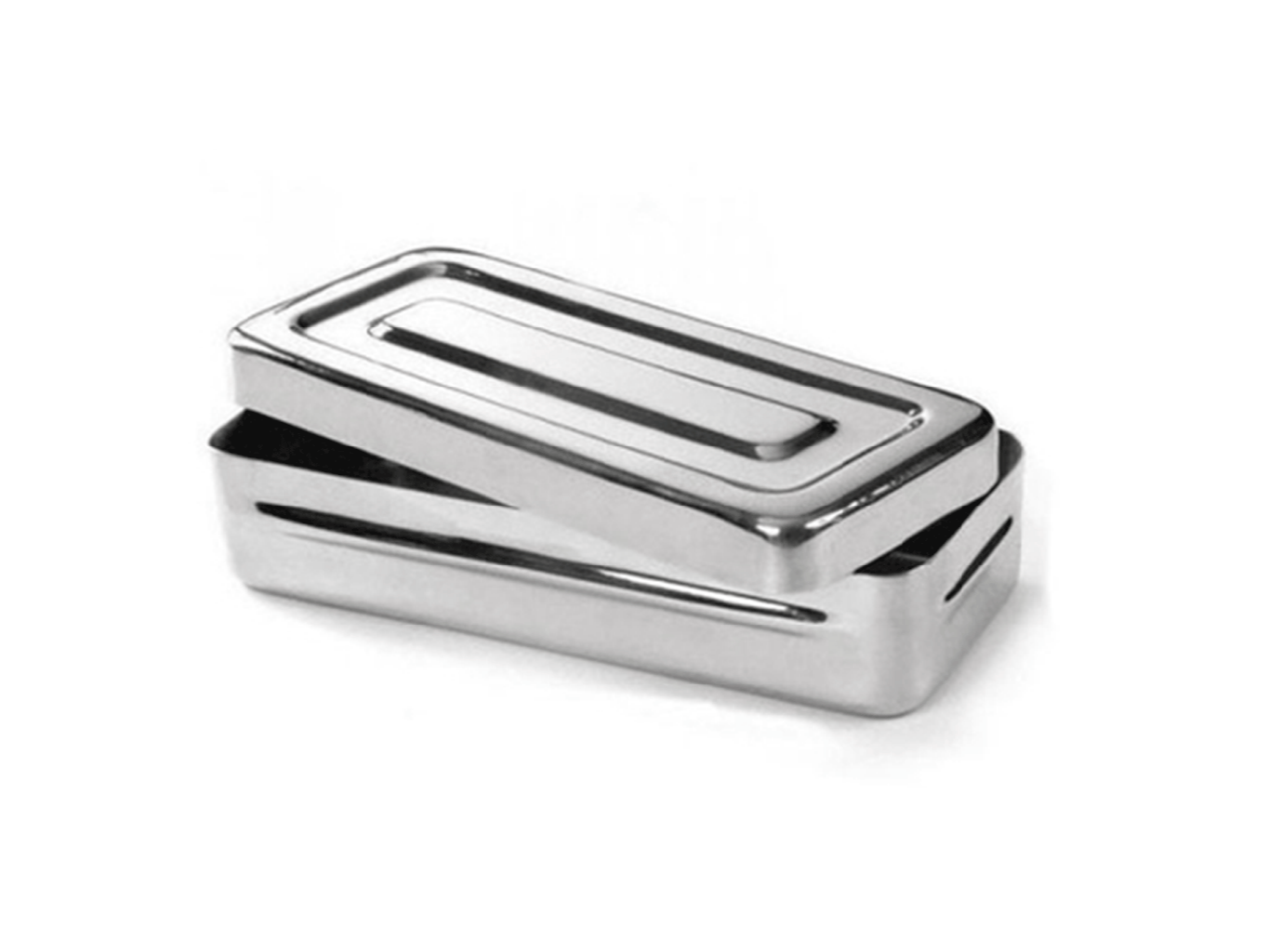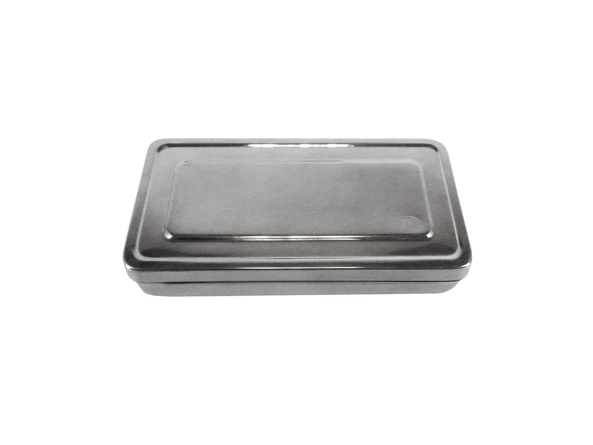 Caja fabricada en acero inoxidable de alta resistencia, ideal para el almacenamiento y transporte seguro de instrumental médico u odontológico.