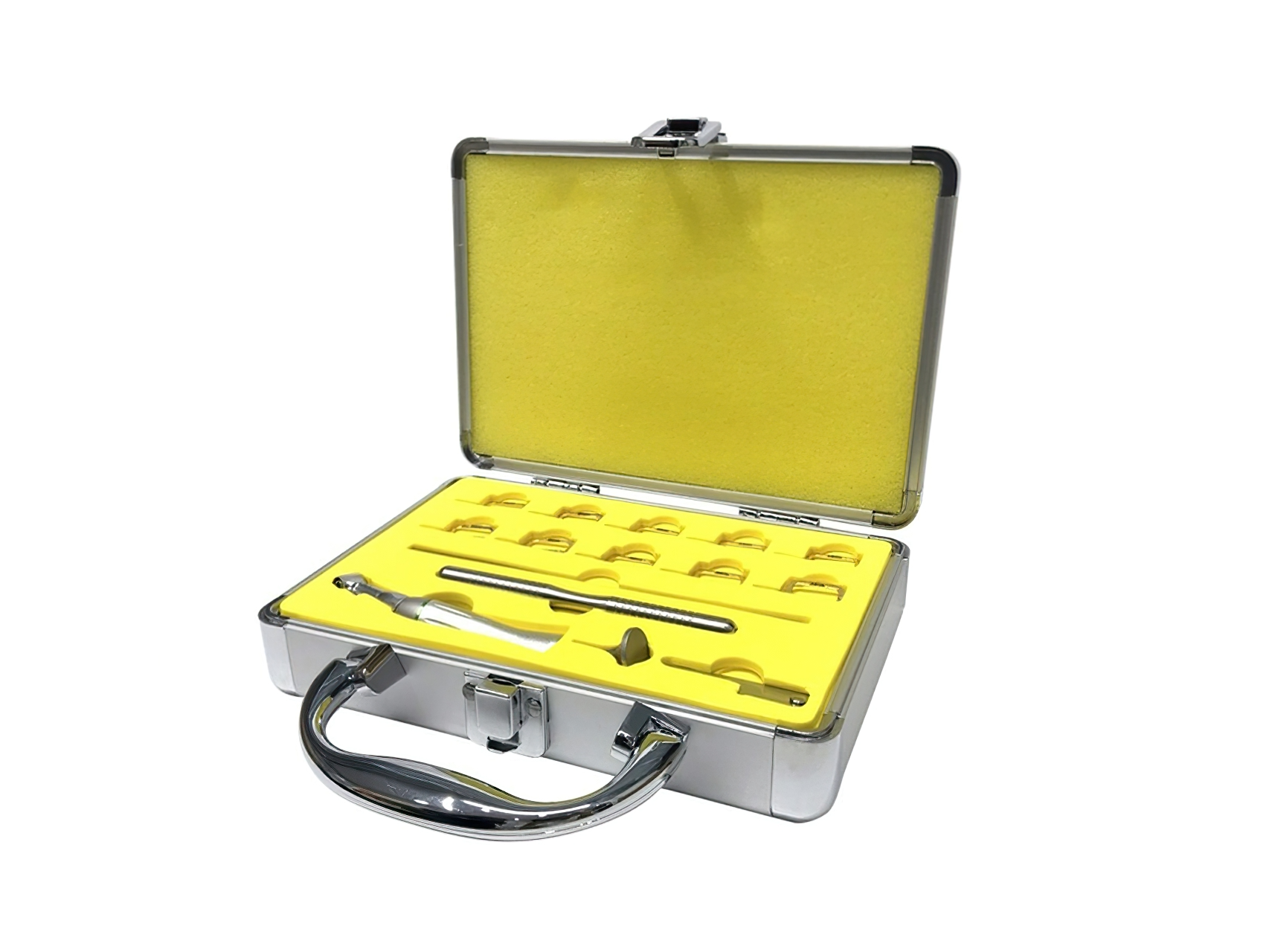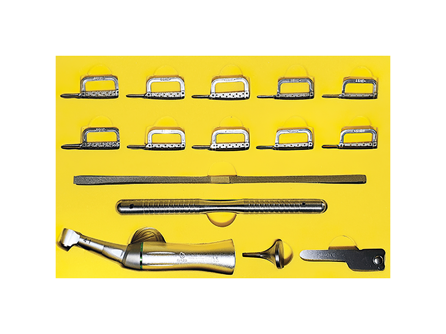 Kit para Stripping con Contra Ángulo 4:1. BESTO Kit profesional para procedimientos de stripping en ortodoncia, diseñado para un desgaste controlado y preciso del esmalte interproximal. Incluye contra ángulo reciprocante 4:1 con rango de 500 a 1.000 rpm, cuchillas y tiras de desgaste, además de accesorios para un trabajo seguro y eficiente. Ideal para la reducción interproximal, ofrece versatilidad en granos y medidas, permitiendo adaptarse a diferentes necesidades clínicas. Contenido del kit: • 1 contra ángulo reciprocante 4:1 (500–1.000 rpm/min). • 10 cuchillas de desgaste: 2x90HD, 2x60HD, 2x40HD, 2x25HD, 2x15HD. • 2 tiras de desgaste interproximal (grano medio y grano fino). • 1 mango para uso manual de cuchillas. • 1 regla para medición de espacio interproximal. • 1 llave saca cuchillas. Presentación: kit completo Marca: Besto Origen: China