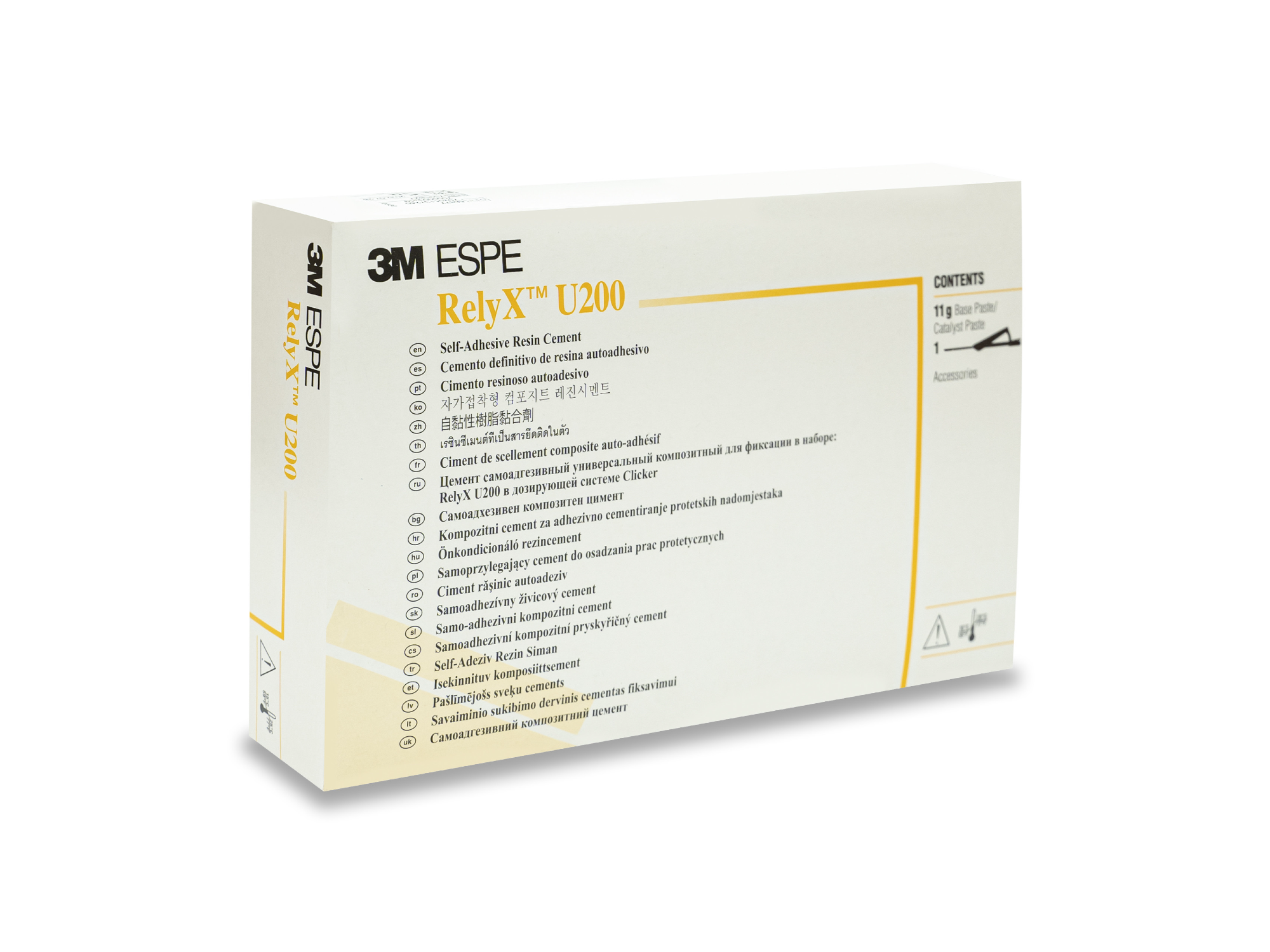 RelyX™ U200 cemento auto–adhesivo universal de resina ayuda a la cementación de todo tipo de restauraciones metálicas, metal porcelana y cerámicas con gran potencia de adhesión, resistente a la humedad, con fórmula en pasta para una mezcla sencilla y homogénea con el dispensador clicker, y ahora en jeringa de automezcla.