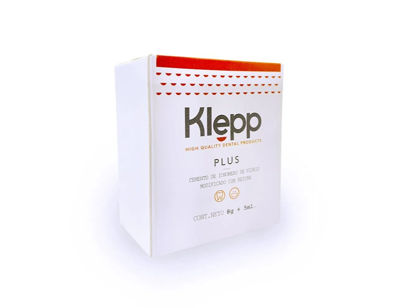 Cemento de fijación radiopaco. Ionómero de vidrio reforzado con resina. Diseñado para la cementación final de coronas, puentes, inlays y inlays de metal, metal porcelana y porcelana pura. Se adhiere química y mecánicamente a la estructura del diente y todo tipo de material del núcleo. Klepp Plus tiene características de fácil manejo, bajo coeficiente de expansión térmica y biocompatibilidad con la estructura dental y el tejido blando.