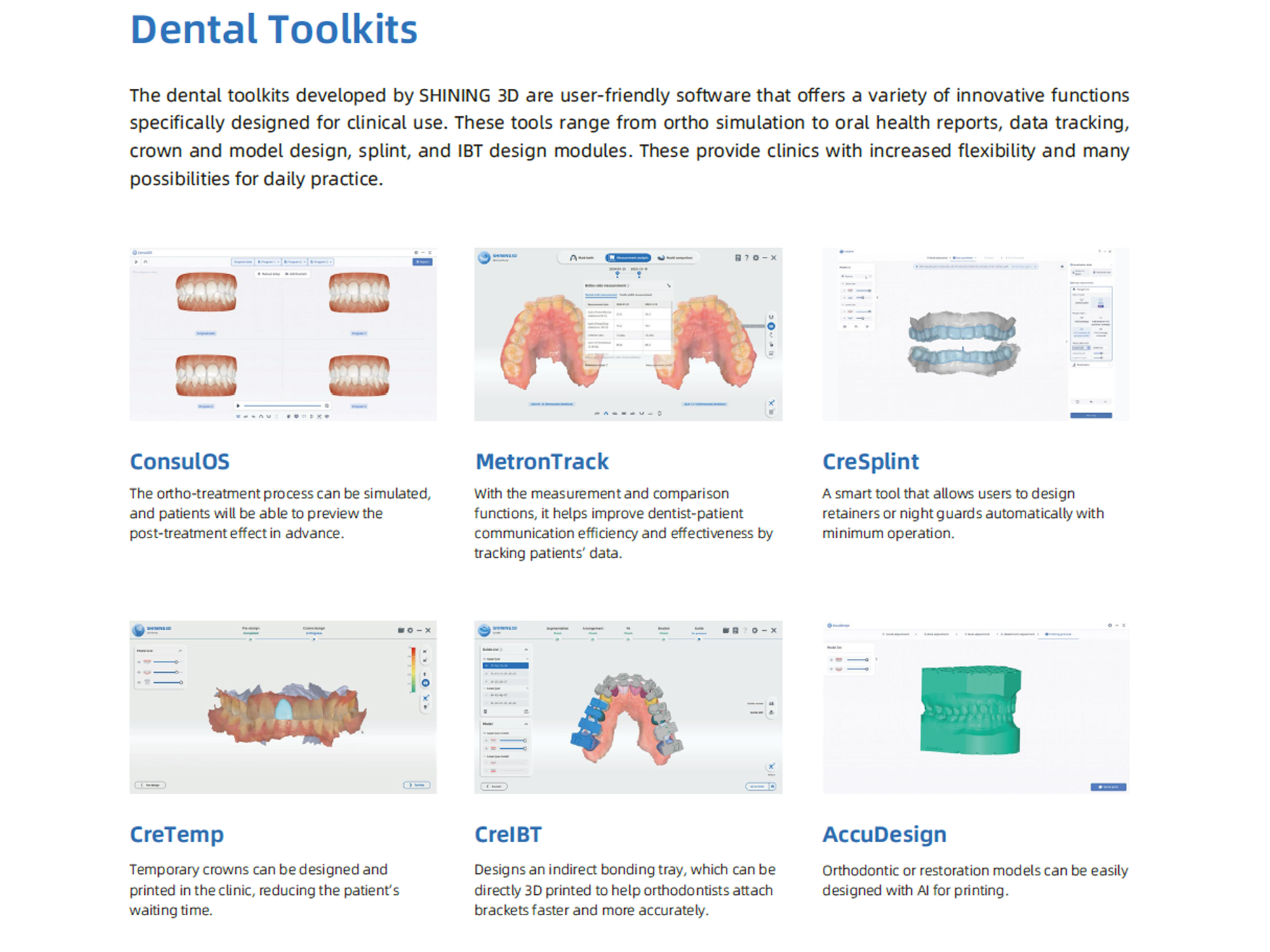 El sistema se integra con el ecosistema SHINING 3D Dental Cloud, que permite gestionar información del paciente, compartir reportes, realizar análisis asistidos por IA y dar seguimiento longitudinal a cambios orales y faciales. También puede complementarse con distintos módulos digitales de la marca para simulación ortodóncica, diseño de retenedores, coronas temporales, modelos y bandejas de cementado indirecto, ampliando el valor del flujo digital dentro de la clínica.