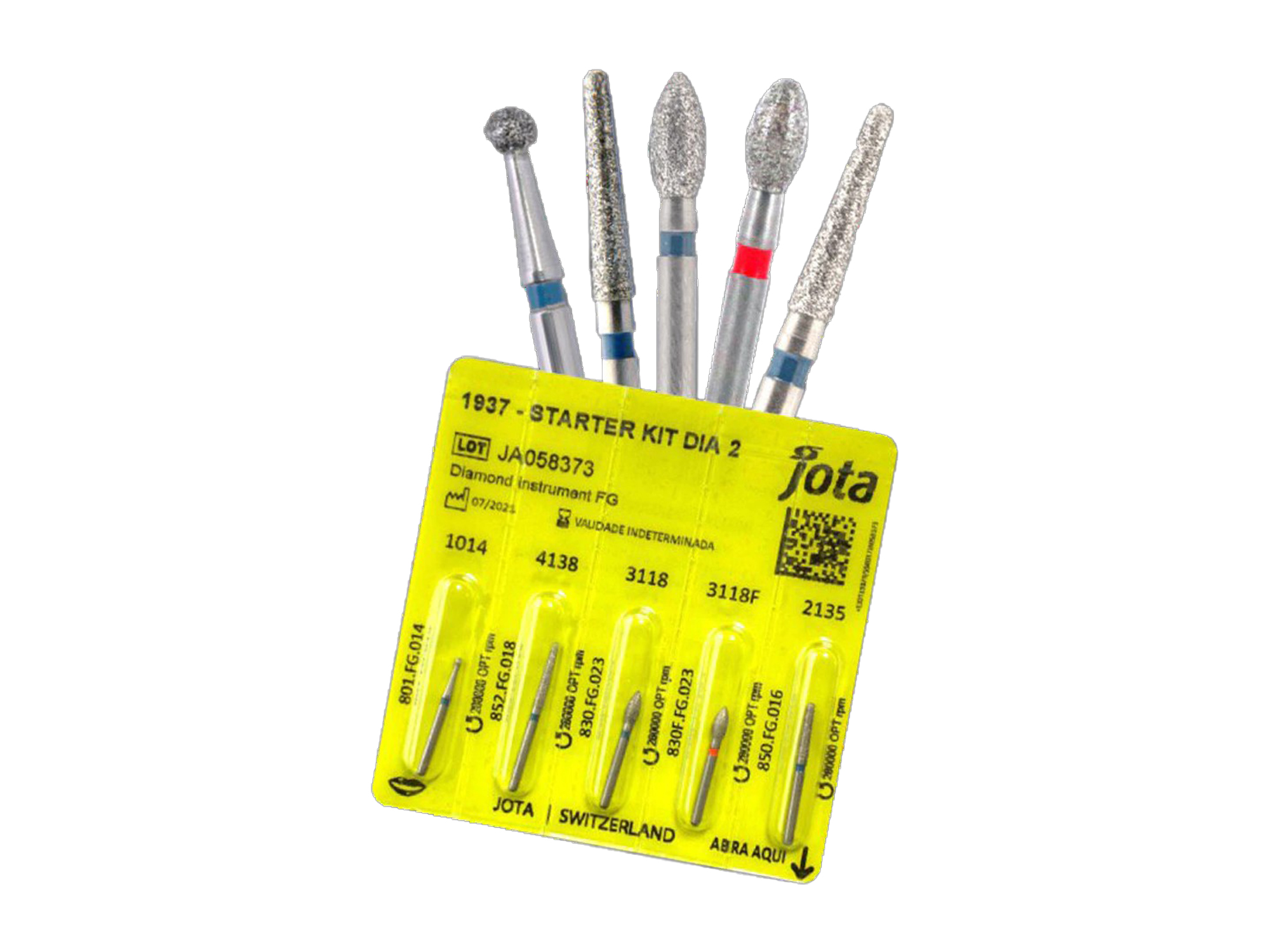 El Starter Kit Dia 2 de JOTA reúne en un solo estuche las 5 piedras de diamante más utilizadas en odontología, ofreciendo practicidad, precisión y alto rendimiento en los procedimientos de tallado y preparación dental.