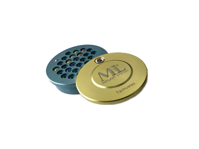 El sistema de tachuelas ML IMPLANT SYSTEM® está compuesto por portatachuelas, punta de tachuelas, capuchón y tachuelas, los cuales se comercializan por separado. Diseñado para procedimientos de regeneración ósea guiada (GBR), permite fijar de manera temporal membranas de titanio o colágeno al hueso del paciente.