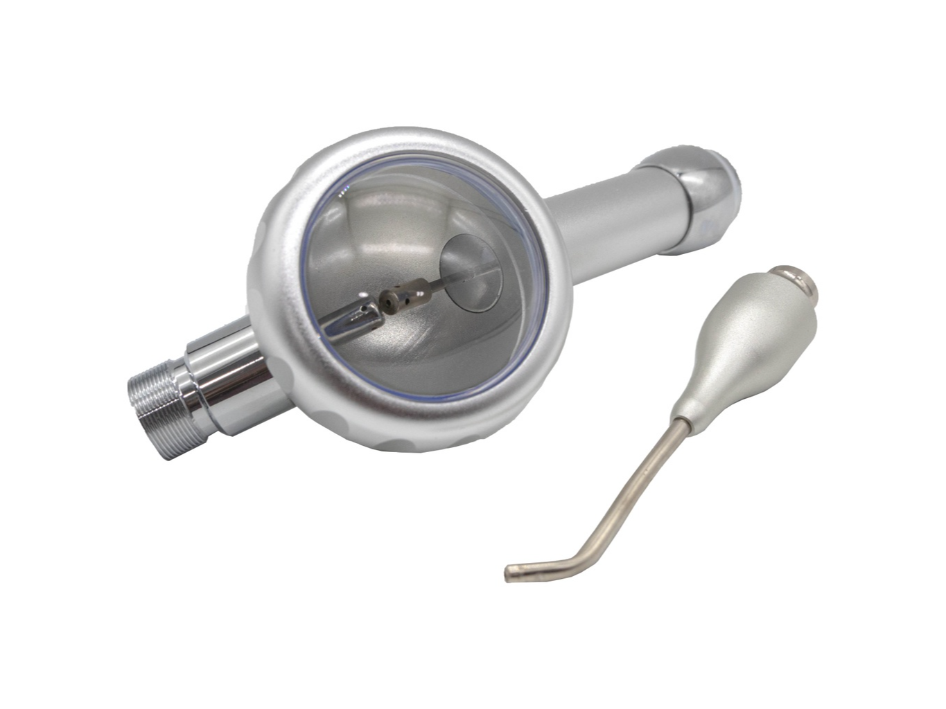 Pistola de profilaxis por chorro de bicarbonato, diseñada para la limpieza efectiva de manchas, placa y sarro en cualquier parte de los dientes. Ofrece una distribución homogénea sin salpicaduras y un diseño especial que evita bloqueos, garantizando un uso seguro y eficiente.