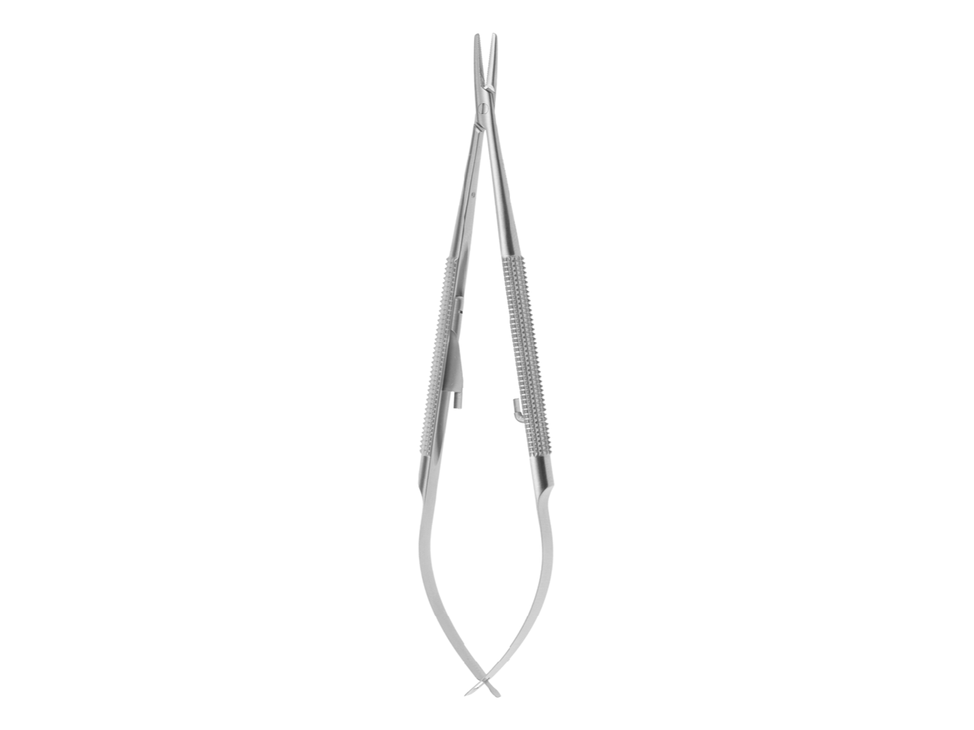 Instrumento quirúrgico de precisión utilizado para sostener y guiar agujas durante procedimientos de sutura en intervenciones quirúrgicas.