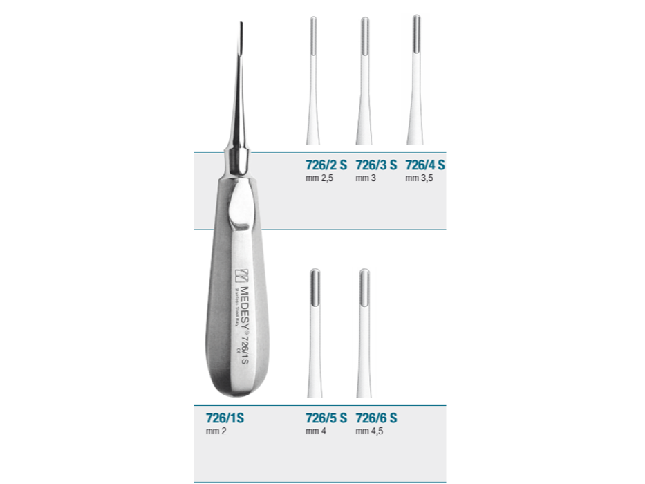 El elevador apical 726 de Medesy está diseñado para actuar como palanca en la extracción de dientes o raíces retenidas, garantizando un procedimiento más seguro y controlado. Fabricado en acero inoxidable de gran calidad, combina resistencia, durabilidad y un acabado que facilita la limpieza y esterilización.