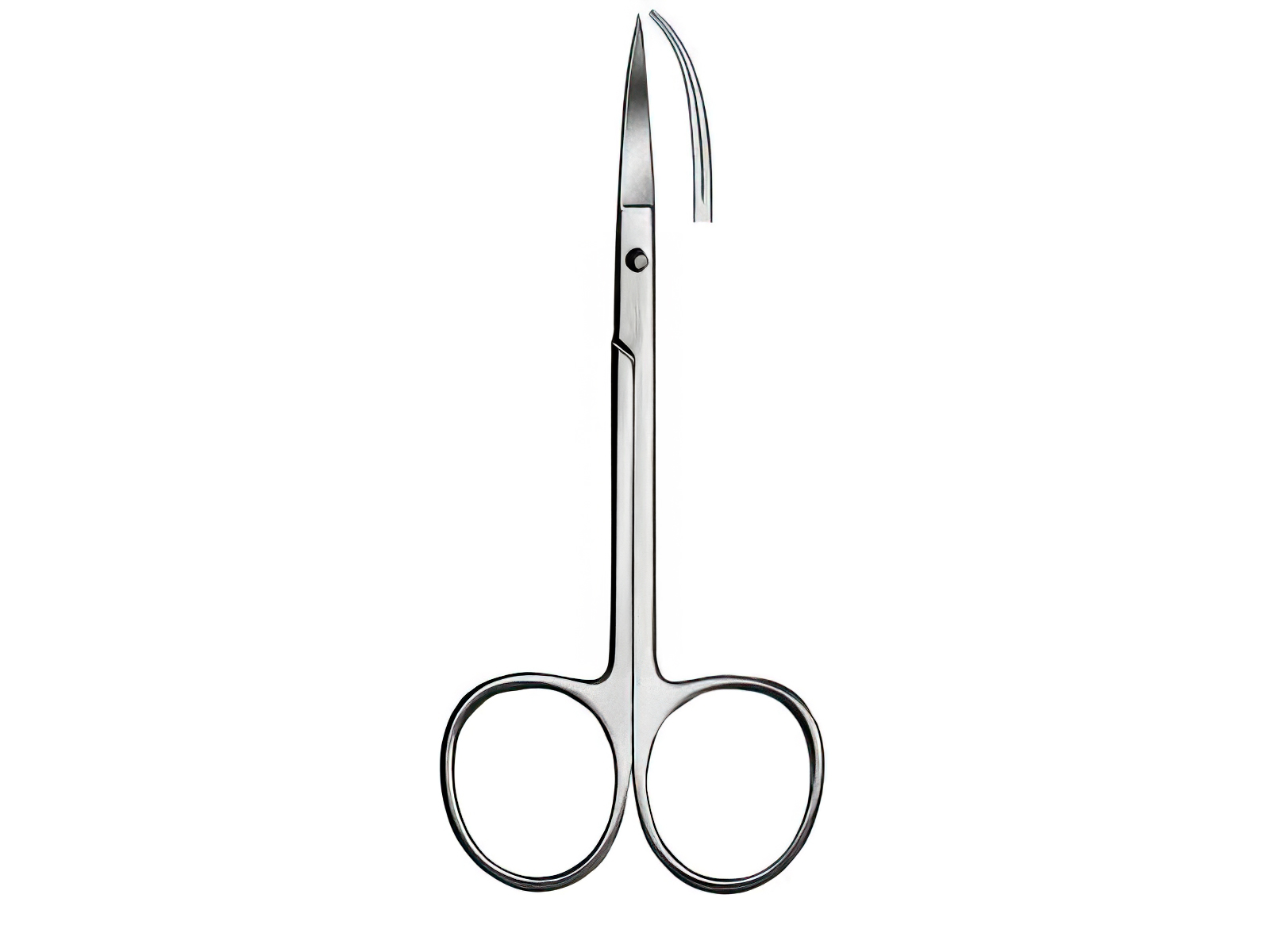 Tijera quirúrgica curva diseñada para procedimientos odontológicos y quirúrgicos menores, especialmente indicada para cortes en encías y manipulación de suturas.