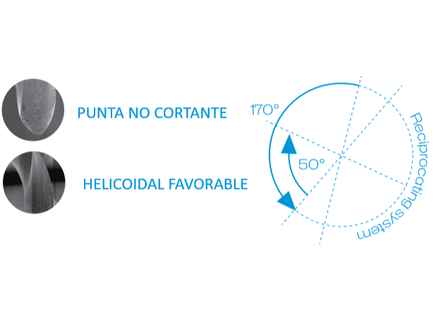 • Punta apical triangular no cortante → facilita un avance seguro y controlado, reduciendo el riesgo de escalones, perforaciones o fracturas
