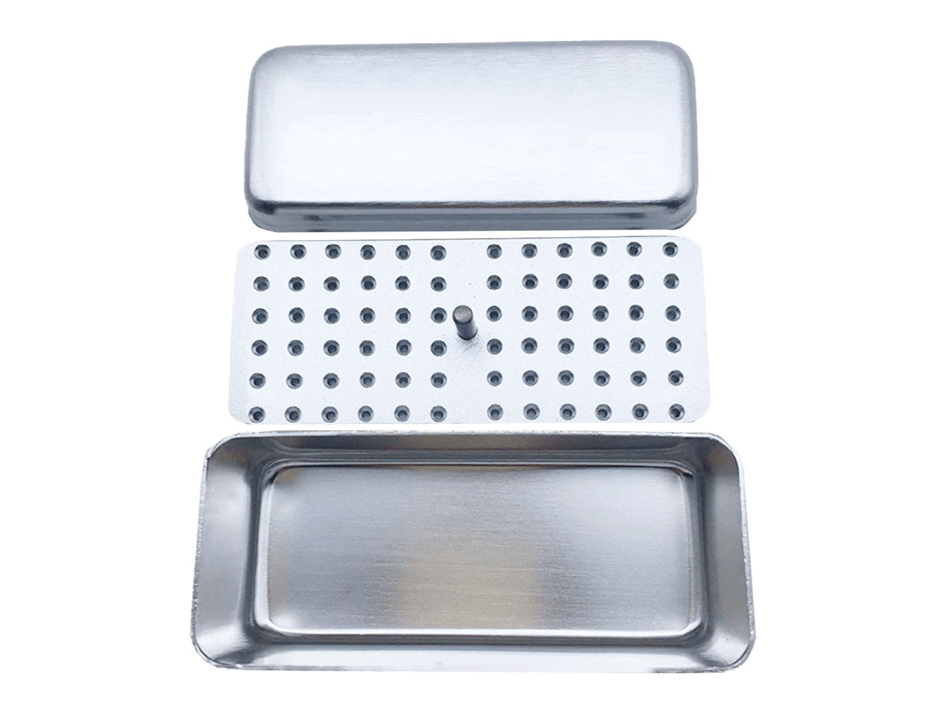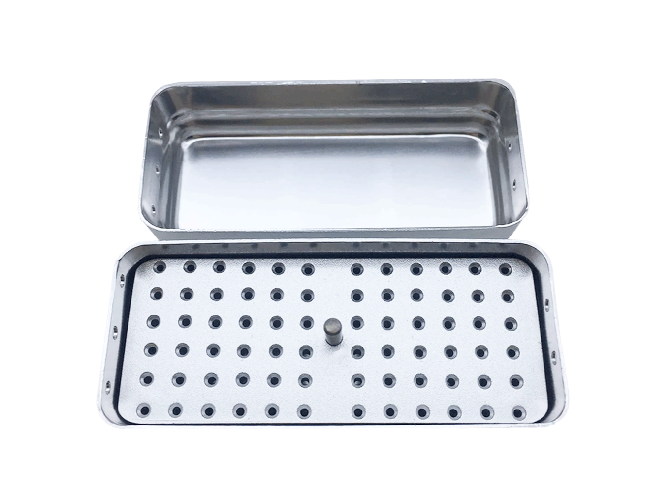Caja metálica de acero inoxidable con tapa, diseñada para el almacenamiento, esterilización y organización de instrumentos de endodoncia. Su tamaño compacto facilita el manejo y la disposición dentro del consultorio, garantizando higiene y durabilidad.