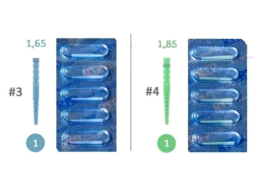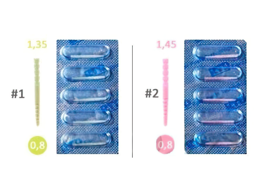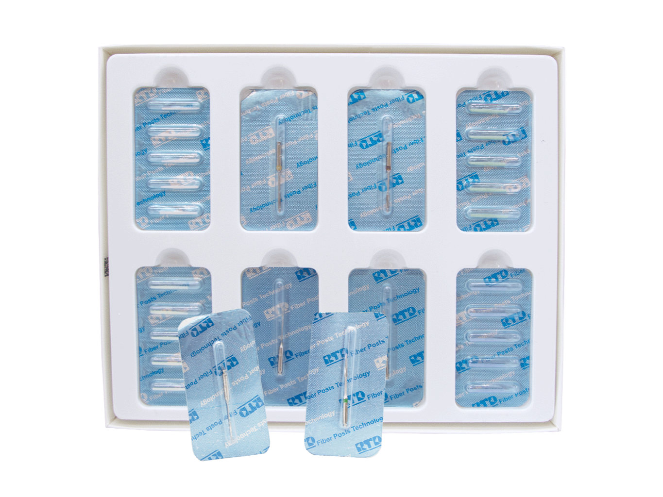 Sistema de postes intrarradiculares de fibra de cuarzo con codificación por colores para una fácil identificación. Los postes coinciden exactamente con las fresas y presentan una propiedad única: el color desaparece al colocarlos en el diente y reaparece con un chorro de agua fría si es necesario retirarlos.